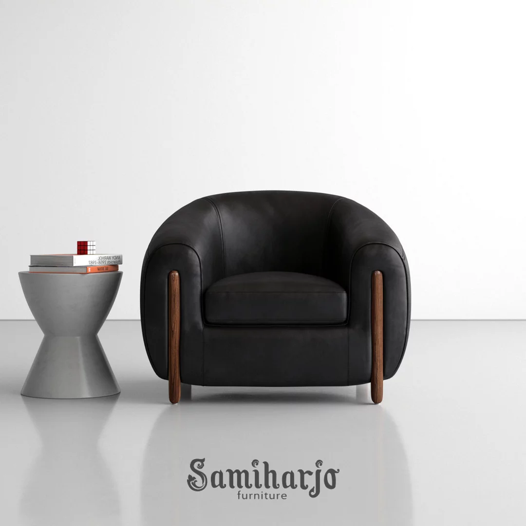 Accent chair leather ini dirancang untuk menghadirkan kenyamanan maksimal sekaligus karakter visual yang kuat. Mengusung bentuk barrel dengan siluet membulat, kursi ini memberikan kesan kokoh namun tetap elegan. Upholstery kulit berwarna hitam menciptakan nuansa mewah dan profesional, dipadukan aksen kayu solid pada kaki sebagai sentuhan natural yang menyeimbangkan tampilan.