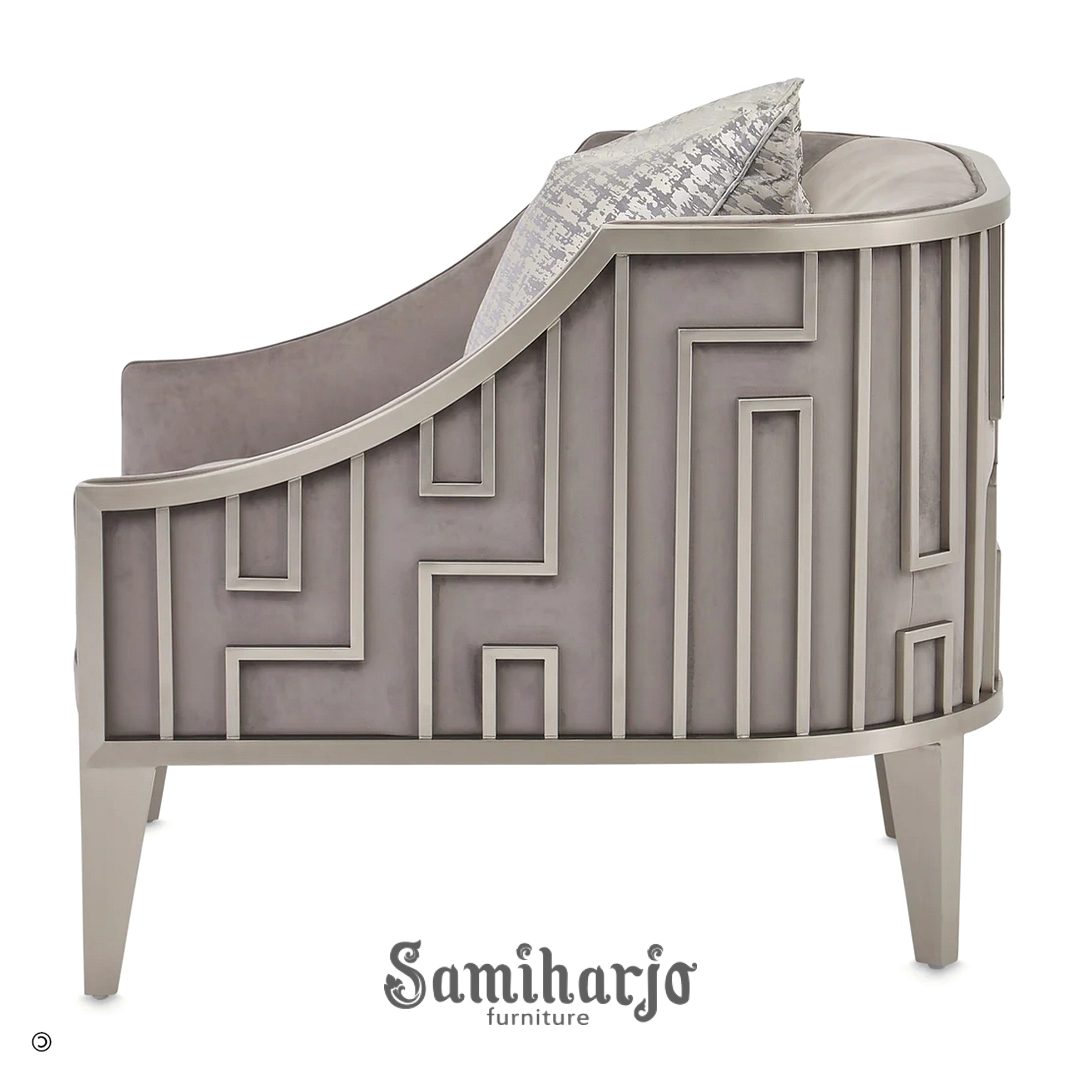 Produk ini dikenal secara global dengan gaya Labirin Mewah Velvet Glamour Chair yang menonjolkan estetika geometris pada sisi sampingnya. Keunggulan utamanya terletak pada desain open-frame yang memberikan kesan luas pada ruangan, sehingga area yang terbatas pun tetap terasa lapang. Lekukan pada sandaran punggung dirancang secara ergonomis guna menopang tubuh dengan sempurna. Selanjutnya, detail pola labirin pada bingkai samping dibuat dengan presisi tinggi melalui teknik pemotongan laser yang sangat halus, menciptakan bayangan visual yang dramatis saat terkena cahaya lampu ruangan.