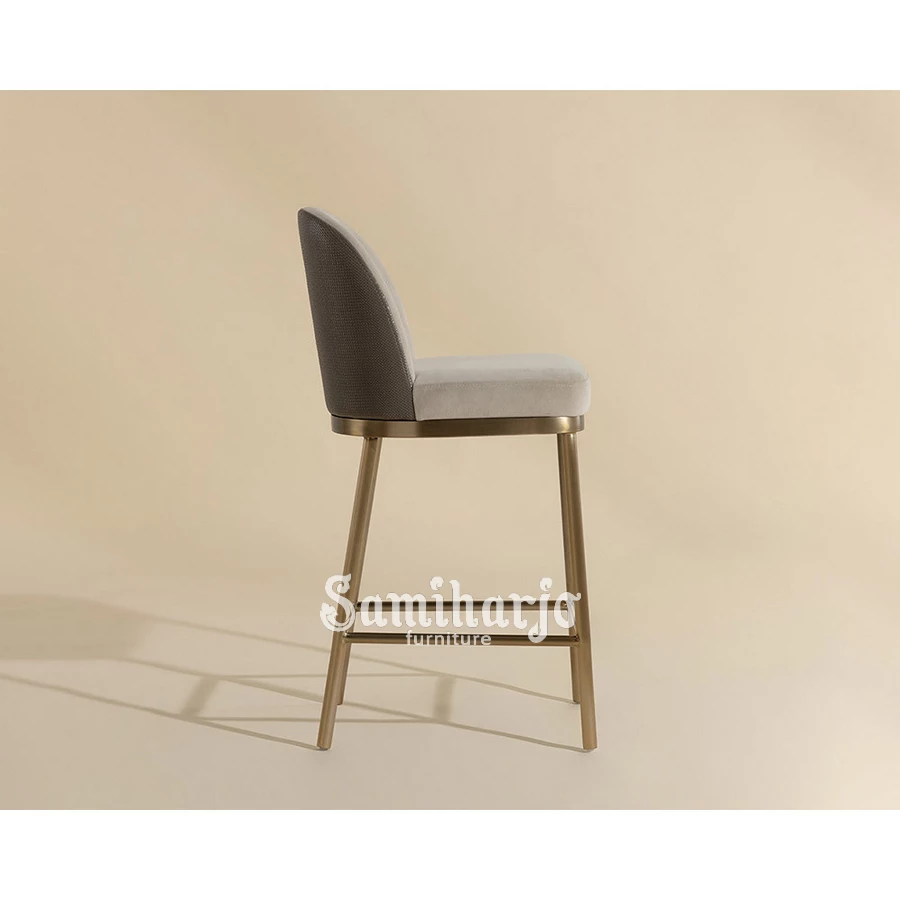 Kombinasi upholstery kain cream dengan rangka besi berwarna emas menciptakan tampilan visual yang sangat elegan. Perpaduan warna ini menghadirkan kesan modern luxury yang sangat cocok digunakan pada interior cafe premium, restoran modern, lounge bar, maupun dapur rumah dengan konsep kitchen island.