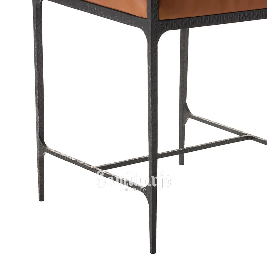 Struktur kaki dibuat menggunakan rangka besi berbentuk garis geometris sederhana. Desain ini menciptakan kesan ringan sekaligus tegas. Pada bagian bawah terdapat pijakan kaki horizontal yang berfungsi meningkatkan kenyamanan sekaligus memperkuat stabilitas struktur kursi. Elemen tersebut juga menjadi detail desain yang memperkaya tampilan industrial.