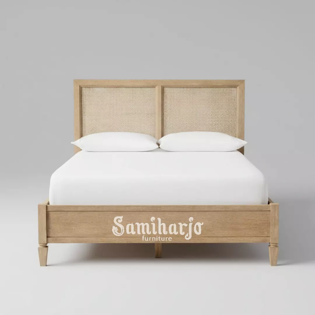 - Fitur tambahan : Headboard rotan breathable, rangka kayu solid kokoh, desain minimal elegan.