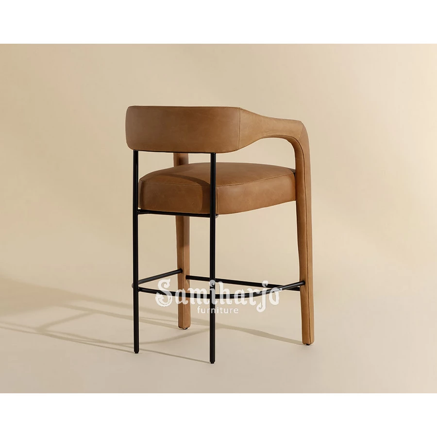 Kombinasi upholstery kulit tan dengan rangka besi hitam menciptakan tampilan kontras yang menarik. Perpaduan ini menghadirkan nuansa modern industrial yang sangat cocok digunakan pada interior cafe kontemporer, restoran modern, lounge bar, hingga dapur rumah dengan konsep kitchen island.