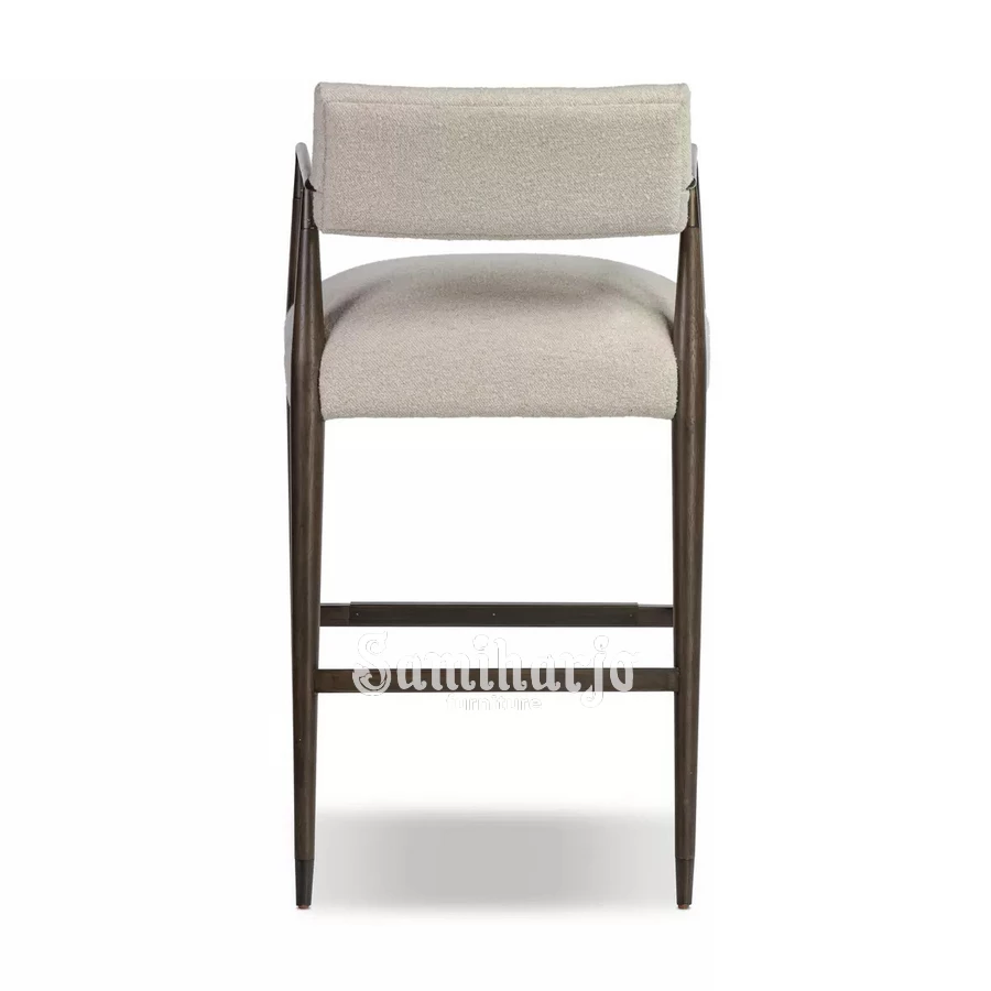 Struktur kaki kursi menggunakan rangka kayu solid dengan bentuk ramping yang stabil. Pada bagian bawah terdapat penguat rangka horizontal yang juga berfungsi sebagai pijakan kaki sehingga memberikan kenyamanan tambahan saat duduk pada posisi tinggi.