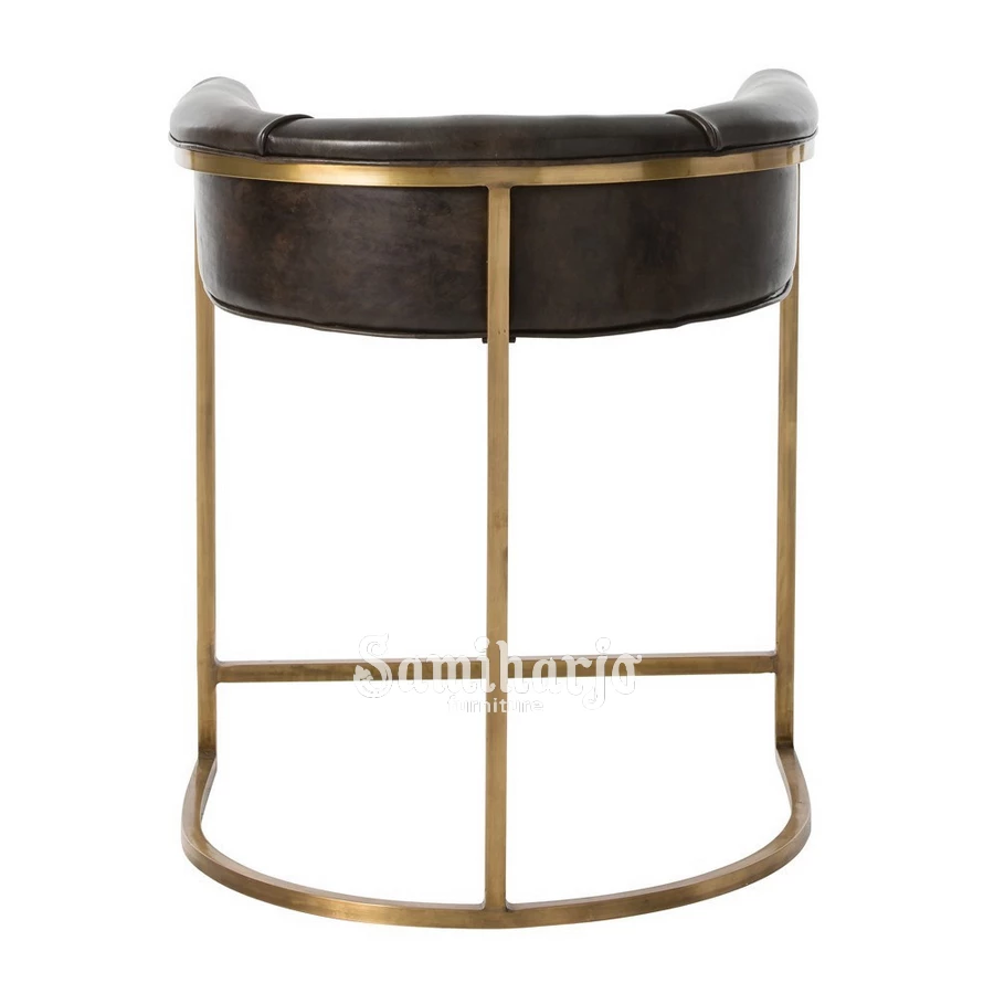 Counter Stool Sandaran Lengkung merupakan kursi tinggi dengan karakter desain elegan yang memadukan material logam berwarna emas dengan dudukan kulit bertekstur vintage. Desain ini menghadirkan nuansa modern luxury yang sangat cocok untuk interior cafe premium, restoran modern, lounge bar, hingga dapur rumah dengan konsep kontemporer. Perpaduan warna coklat tua pada dudukan dan finishing emas pada rangka menciptakan kontras visual yang hangat sekaligus berkelas.