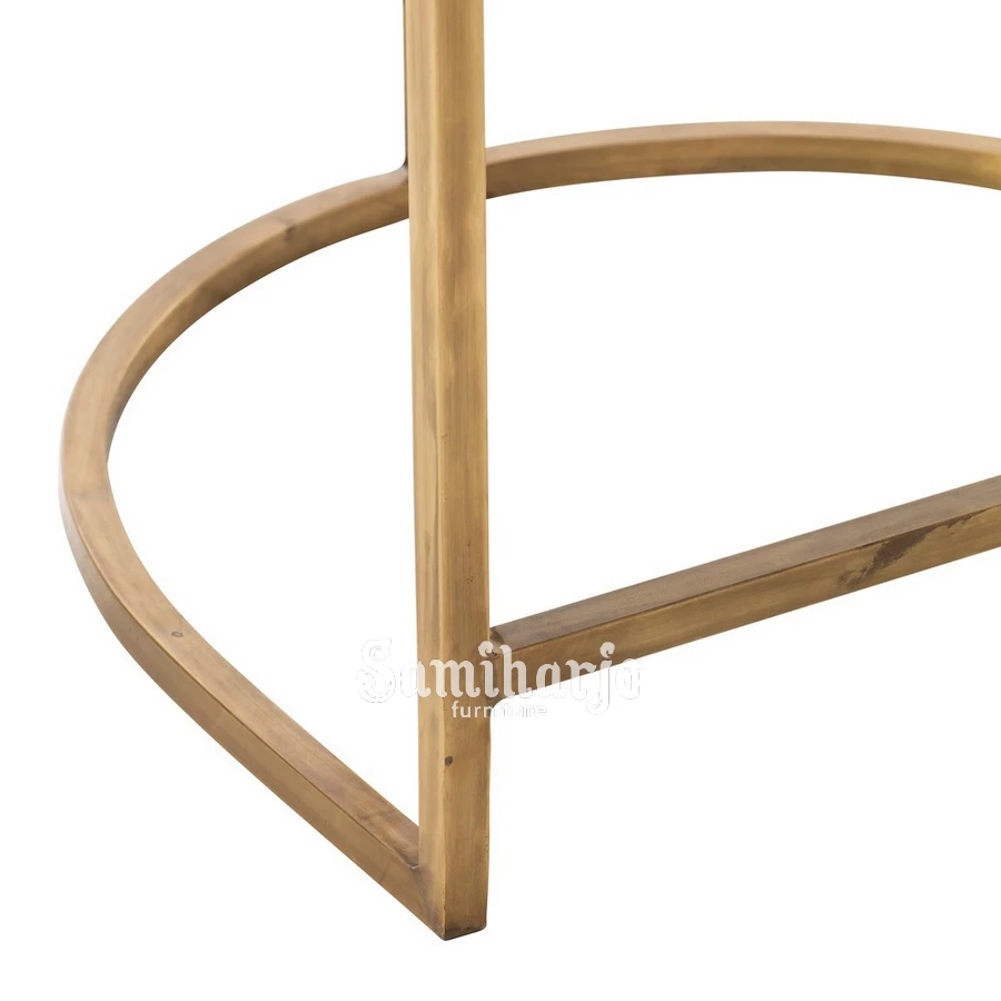 Rangka kursi dibuat menggunakan material stainless steel yang dibentuk dengan garis minimalis. Bagian bawah kursi memiliki struktur lingkaran yang berfungsi sebagai pijakan kaki sekaligus penguat rangka. Detail ini memberikan stabilitas ekstra serta menambah karakter desain yang unik.