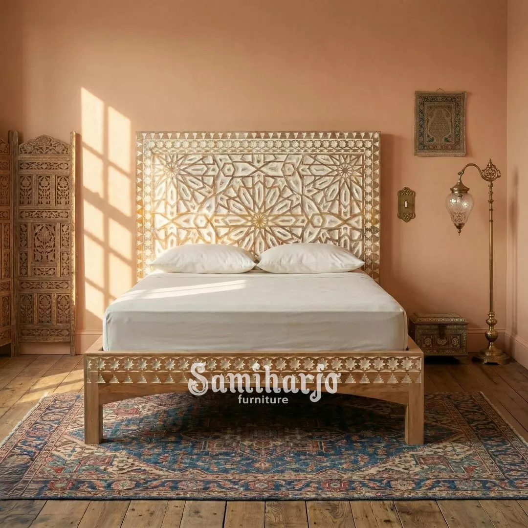 Keunikan utama ranjang ini terletak pada headboard besar yang dihiasi ukiran pola geometris kompleks. Motif tersebut terinspirasi dari ornamen arsitektur klasik Andalusia dan seni dekoratif Timur Tengah yang terkenal akan komposisi simetri serta detailnya yang memukau. Pola bintang, garis radial, serta elemen geometris saling terhubung membentuk komposisi visual yang sangat artistik.