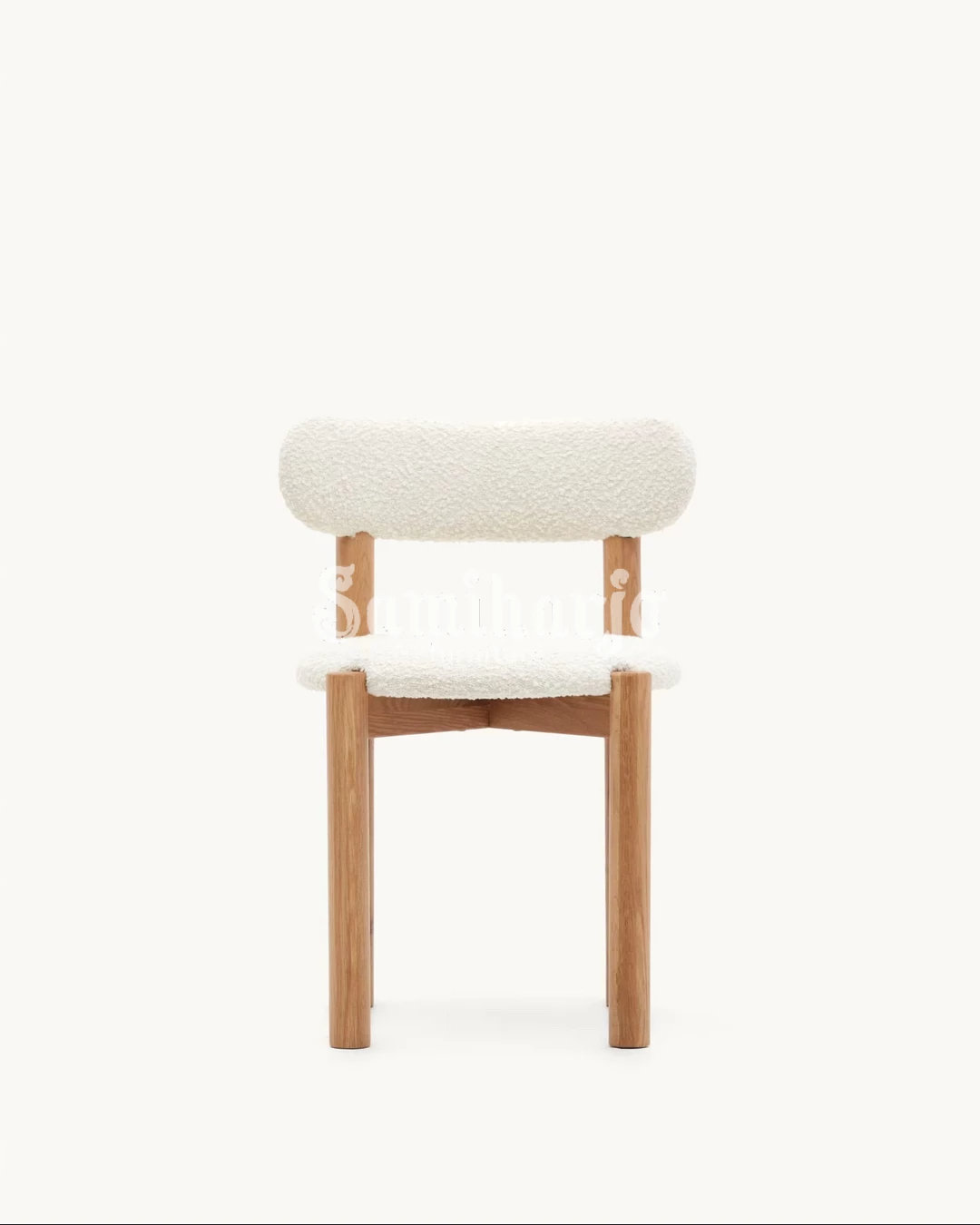 Secara visual, kursi tampil dengan siluet membulat yang halus dari sandaran hingga armrest. Upholstery kain berwarna netral menciptakan kesan lembut, hangat, dan mudah menyatu dengan berbagai palet interior. Kombinasi kain lembut dan kaki kayu solid menghasilkan keseimbangan antara kenyamanan modern dan karakter natural.