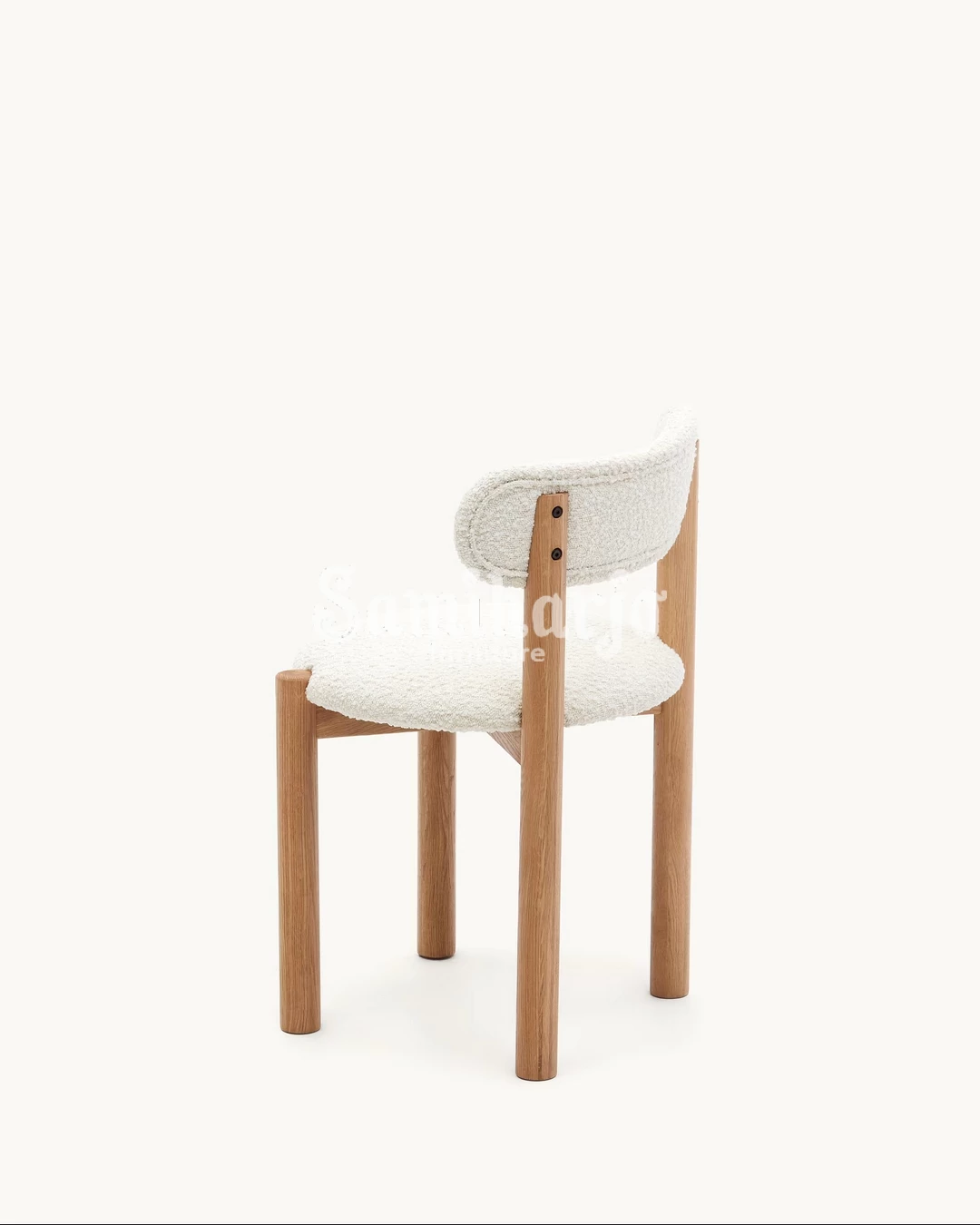 Kursi ini mengusung desain yang secara global dikenal sebagai Nordic Upholstered Dining Armchair, sebuah gaya furnitur yang berkembang dari desain Skandinavia modern dan pendekatan soft minimalism Eropa. Ciri utama desain ini terletak pada sandaran melengkung setengah tertutup yang memberikan rasa memeluk, sekaligus mempertahankan tampilan ringan dan bersih. Kursi ini dirancang untuk menghadirkan kenyamanan duduk yang optimal pada ruang makan tanpa kehilangan kesan elegan.