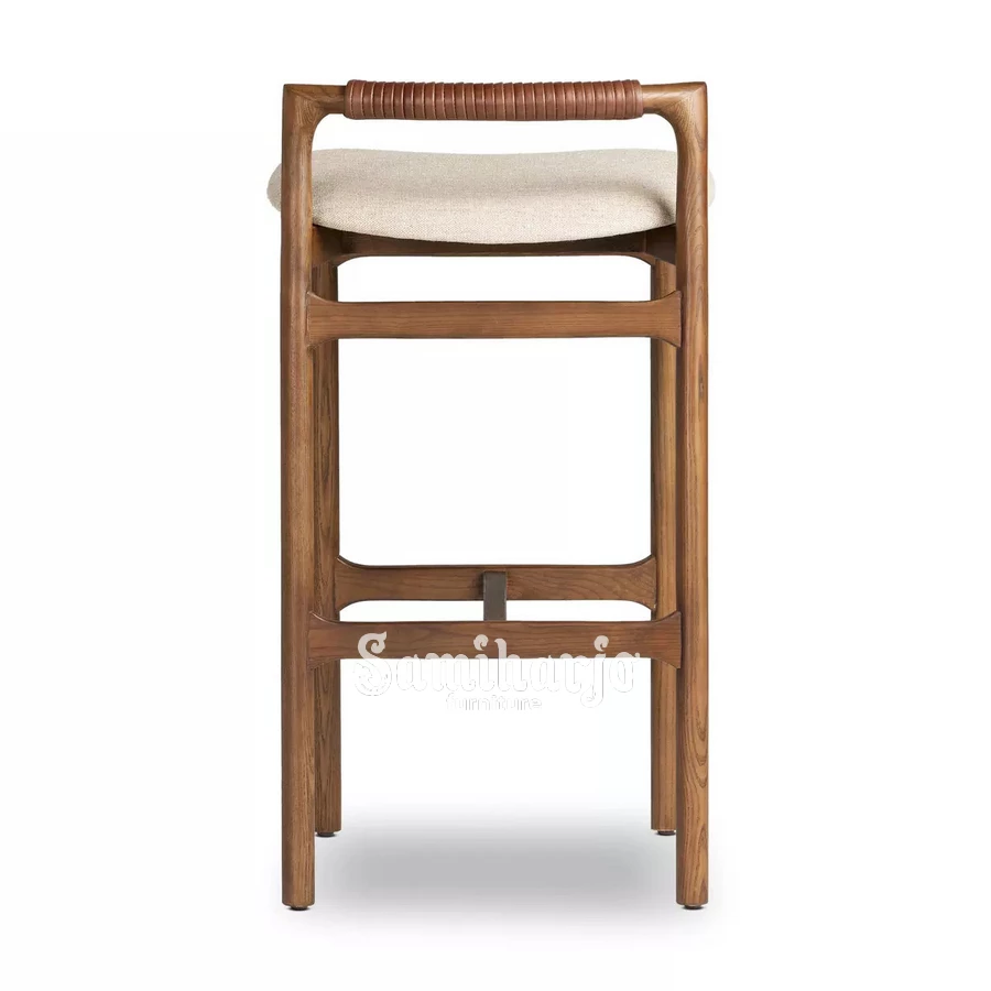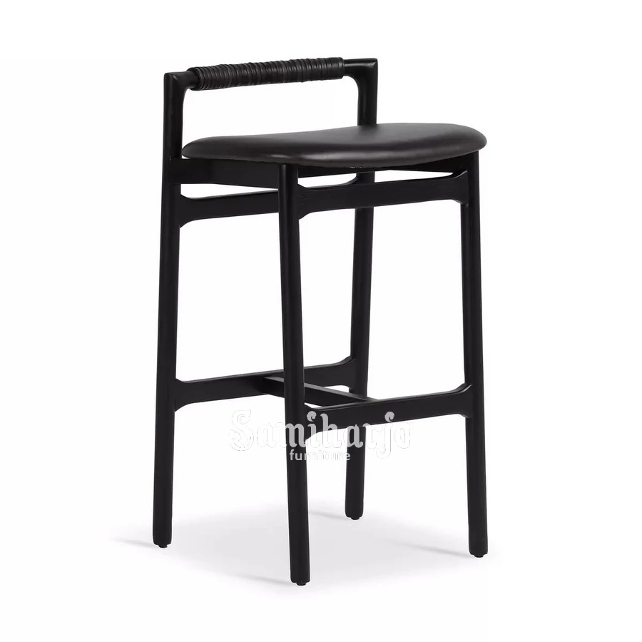 Kursi Bar Orlan memiliki desain yang menonjol pada bagian sandaran berbentuk handle horizontal. Bagian ini dilapisi rotan lilit yang memberikan tekstur visual menarik sekaligus meningkatkan kenyamanan saat digunakan sebagai pegangan. Desain ini memberikan kesan modern sekaligus natural.