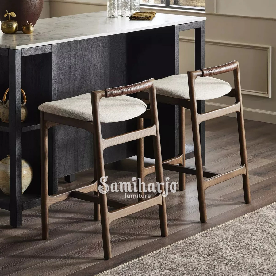 Desain keseluruhan Kursi Bar Orlan menampilkan harmoni antara bentuk modern dan detail tradisional yang diolah secara kontemporer.