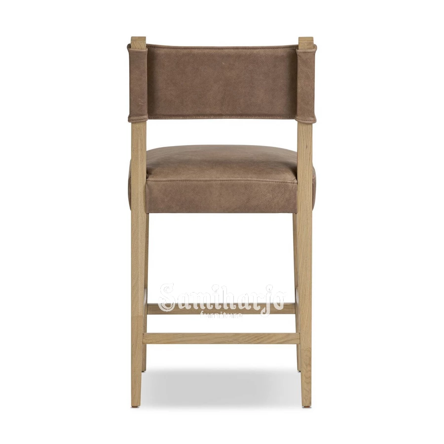 Keunikan utama Kursi Bar Savira Leather Strap terletak pada desain sandaran punggung yang menggunakan material kulit asli. Panel kulit tersebut dibentangkan di antara dua rangka kayu sehingga membentuk sandaran yang fleksibel dan nyaman. Selain memberikan dukungan ergonomis pada punggung, detail ini juga menambah karakter visual yang elegan.