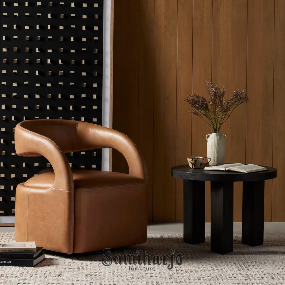 Dudukan berbentuk blok solid dipadukan dengan sistem putar tersembunyi di bagian bawah, memberikan fleksibilitas gerak tanpa mengganggu tampilan visual. Model ini sangat dekat dengan desain global yang dikenal sebagai modern swivel lounge chair, sering digunakan pada ruang tamu premium, lounge hotel, hingga area duduk eksklusif berkonsep kontemporer.