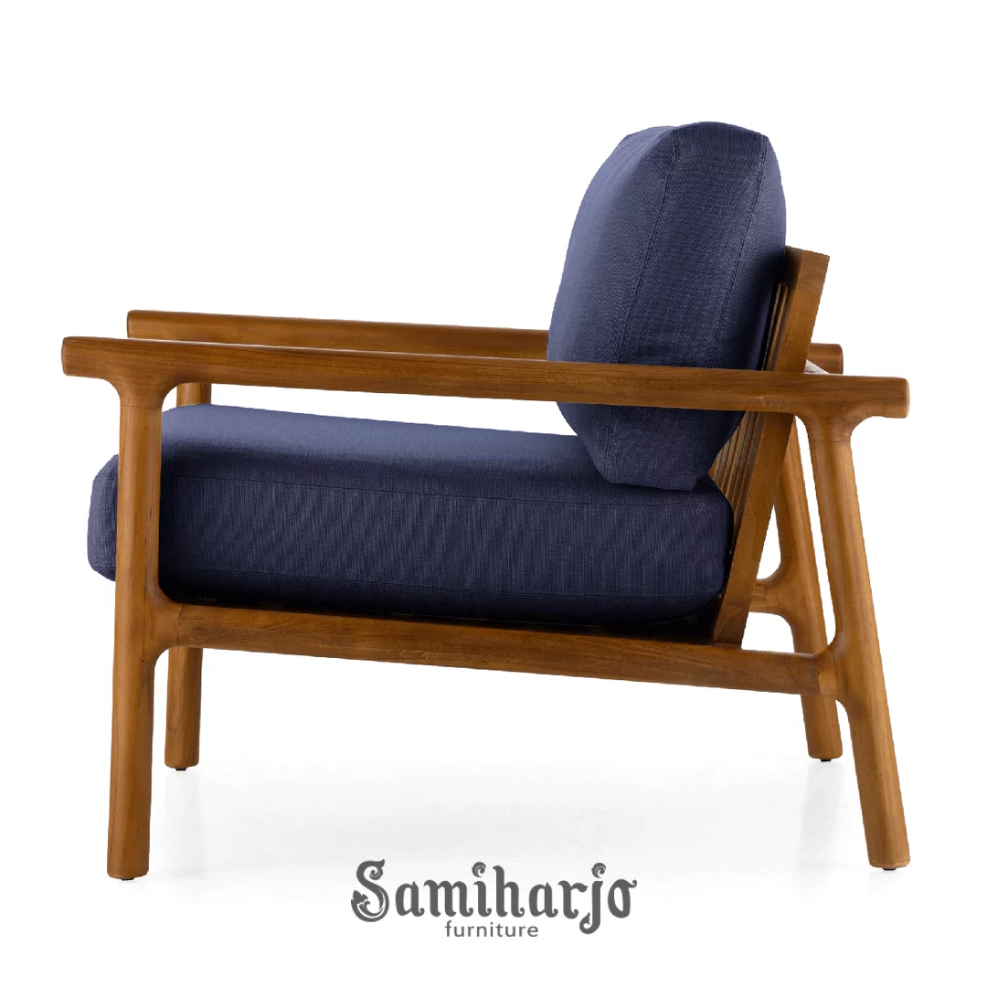 Bentuk sandaran yang sedikit condong berpadu dengan dudukan lebar menciptakan pengalaman duduk yang rileks. Kombinasi kayu jati alami dan upholstery kain memberi kesan bersih, modern, sekaligus timeless. Kursi ini cocok menjadi focal point ruangan tanpa terlihat berlebihan.