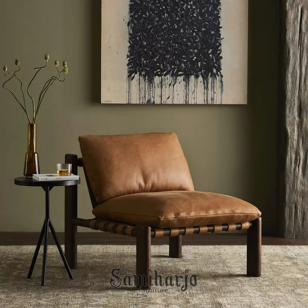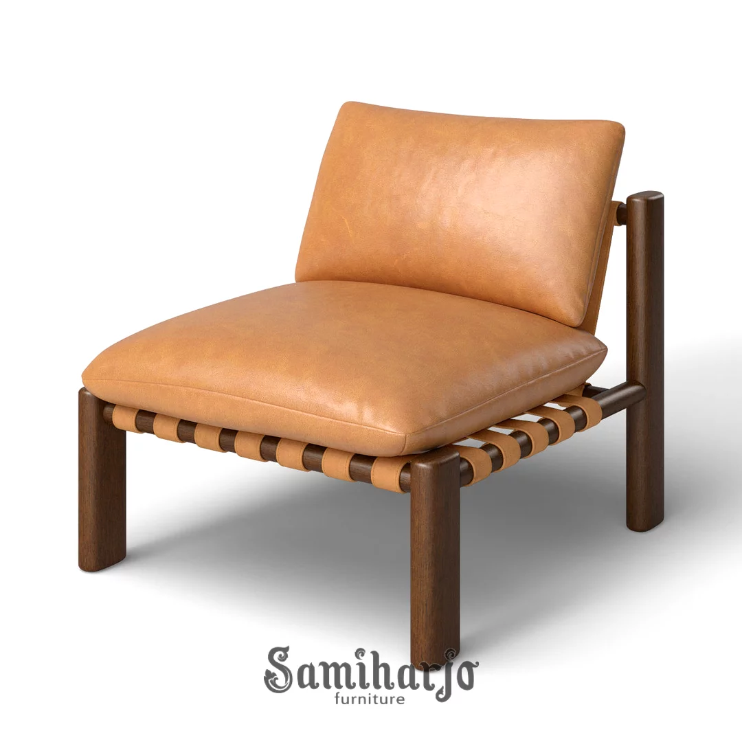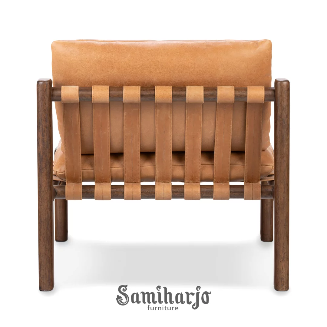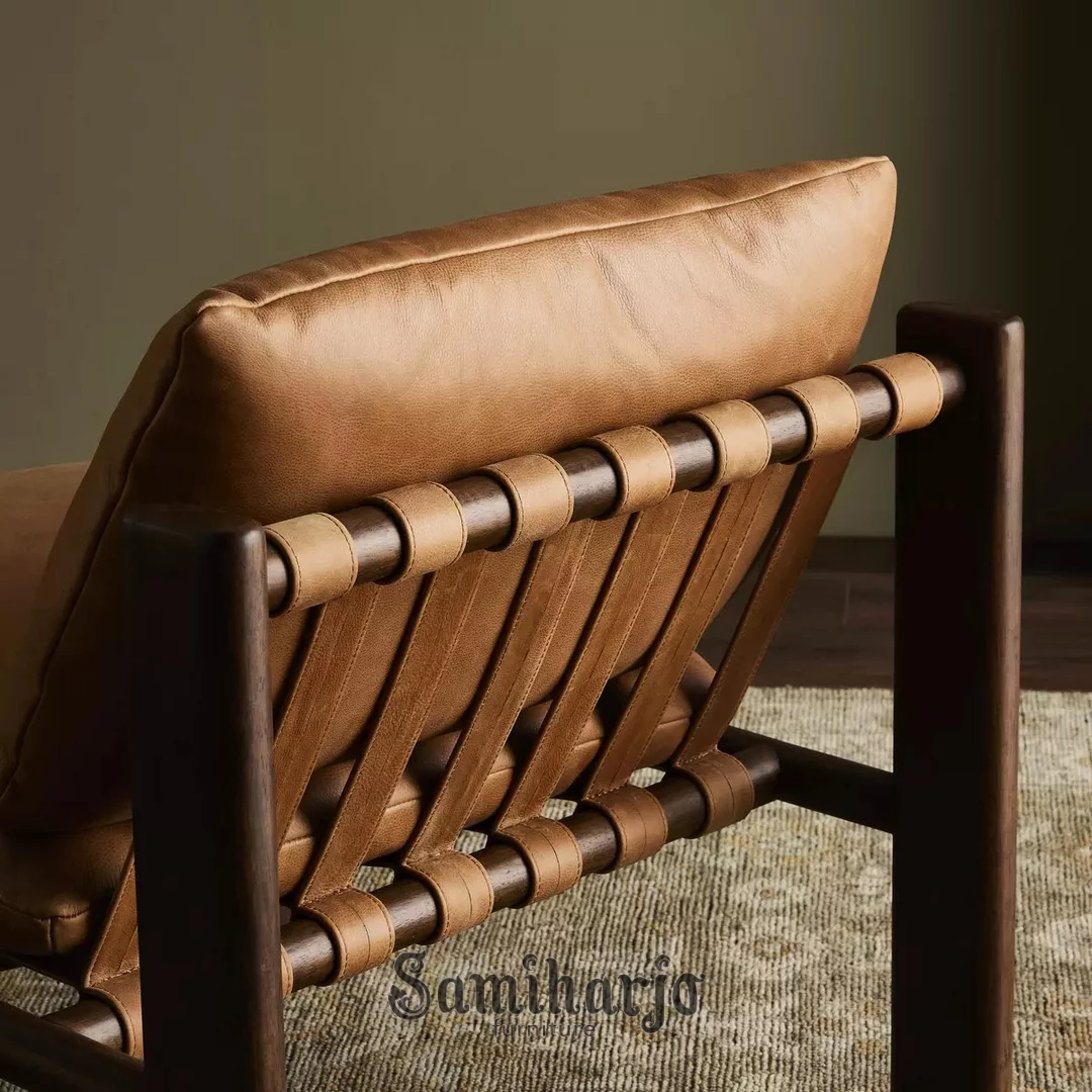 Kursi santai kayu ini menghadirkan karakter desain mid century modern yang kuat dan berkelas. Dudukan serta sandaran dibalut upholstery kulit bernuansa hangat, dipadukan rangka kayu solid berwarna gelap yang kokoh dan presisi. Detail strap kulit anyam pada bagian dudukan menjadi elemen visual sekaligus struktural yang menonjolkan keahlian pengerjaan.