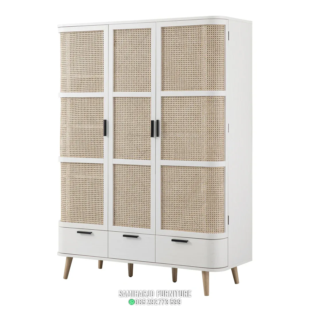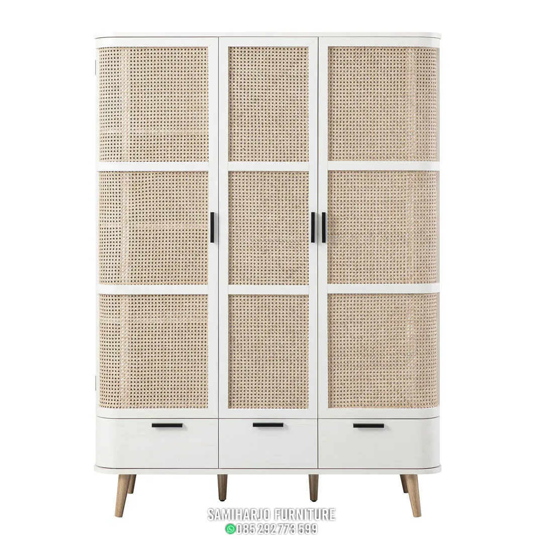Lemari kamar rotan modern ini memiliki tiga pintu utama dengan pembagian panel grid yang tersusun simetris. Setiap pintu terdiri dari beberapa bidang rotan yang memberikan tekstur visual menarik sekaligus memperkuat kesan modern. Frame kayu dibuat ramping namun kokoh, menciptakan tampilan ringan yang tetap stabil.