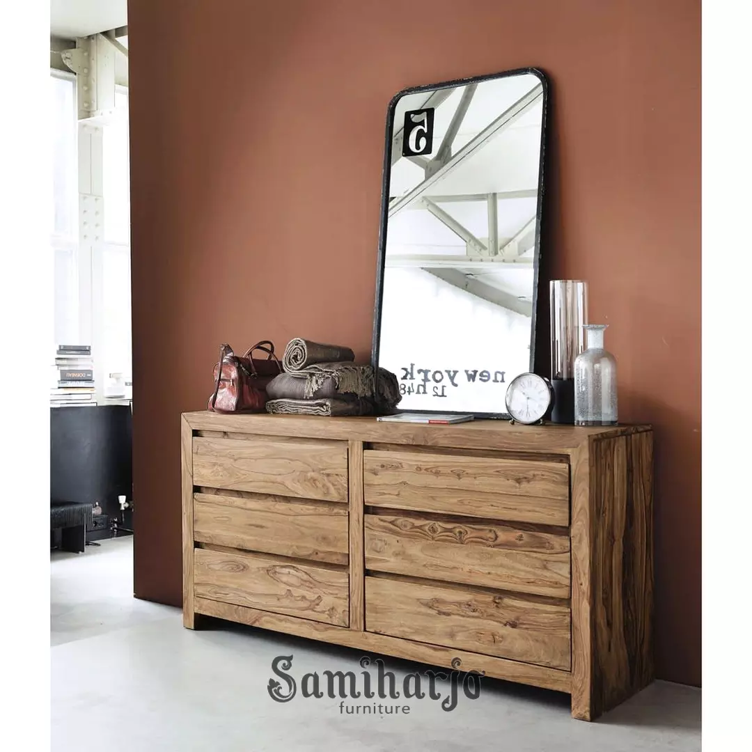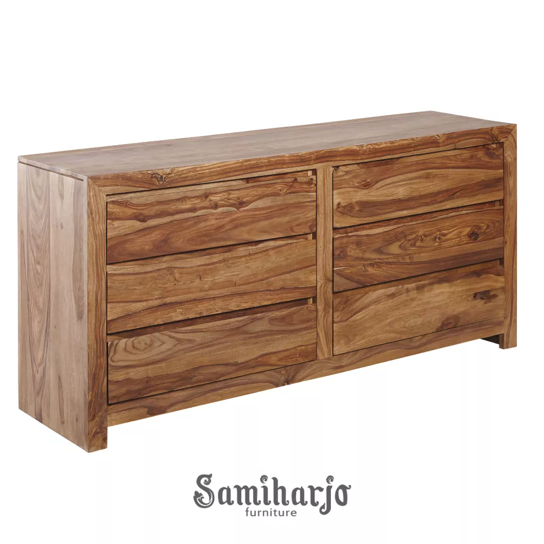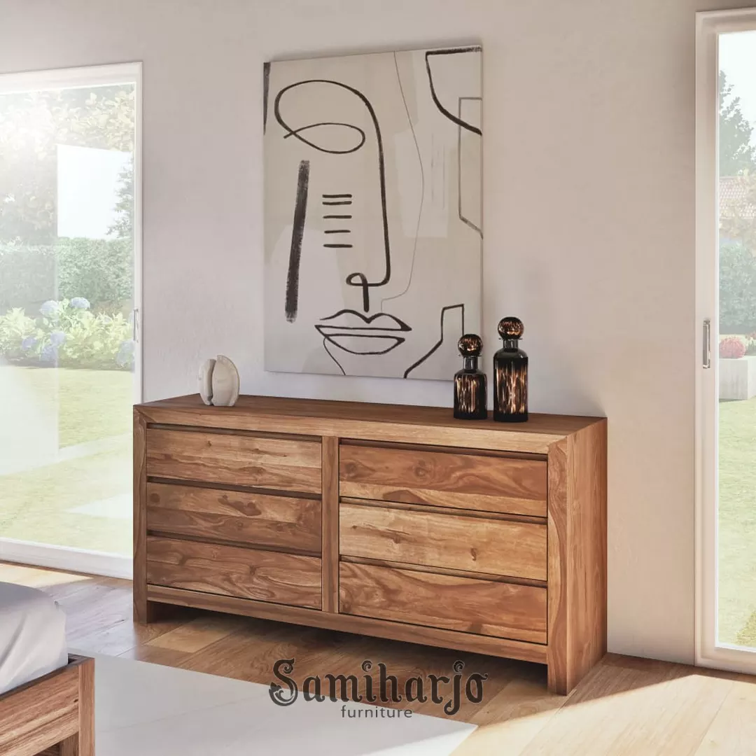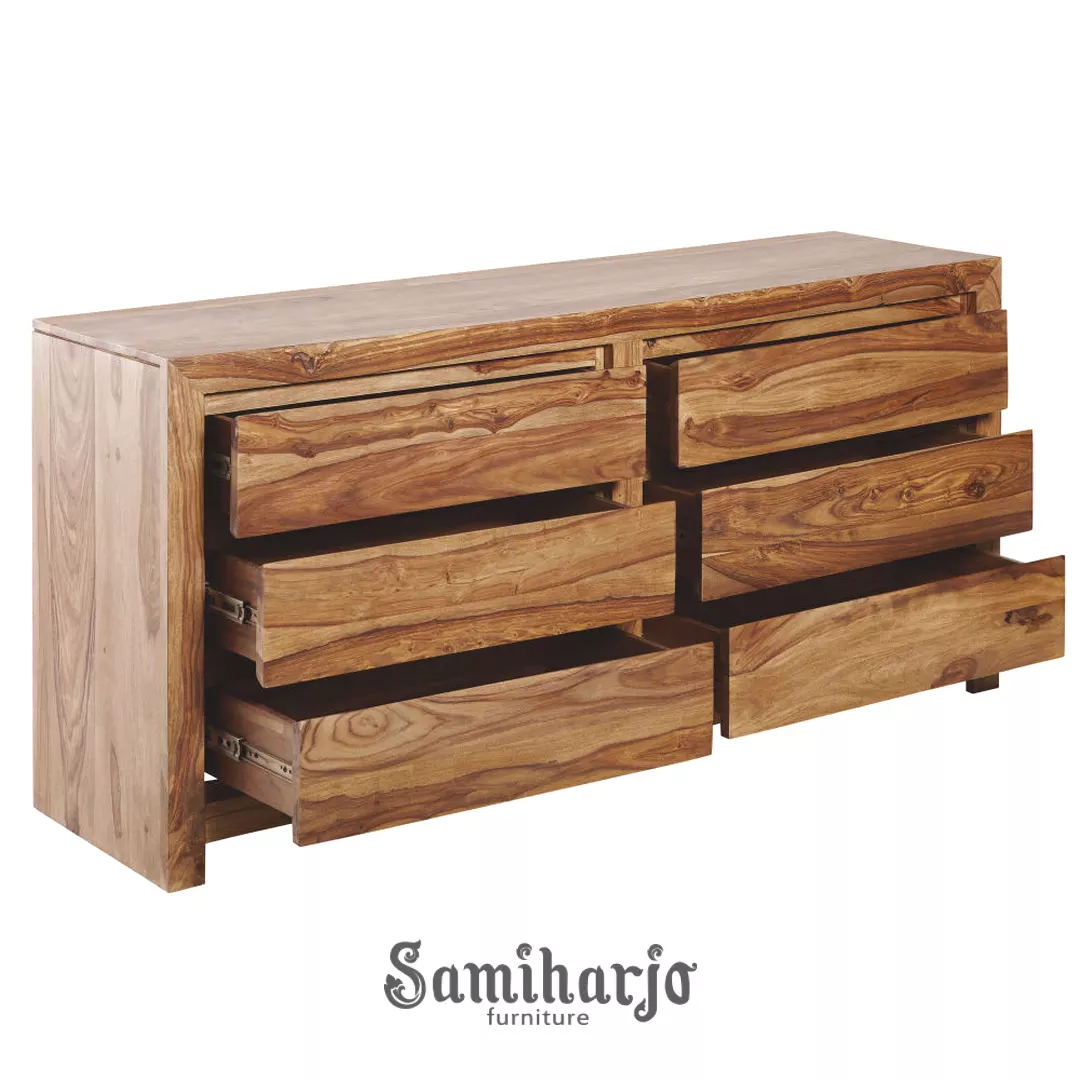 dresser laci trembesi memiliki proporsi horizontal yang tegas, memberikan kesan stabil dan elegan. Susunan laci dibuat simetris dengan enam laci lebar, menciptakan keseimbangan visual yang rapi. Setiap fasad laci dibuat dari papan kayu utuh sehingga alur serat mengalir alami tanpa terputus, menambah kesan eksklusif dan bernilai tinggi.