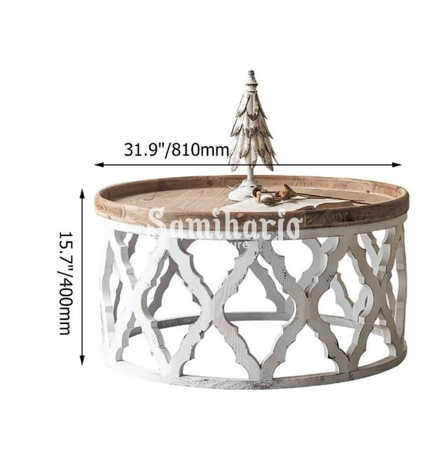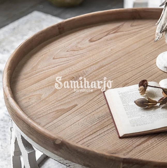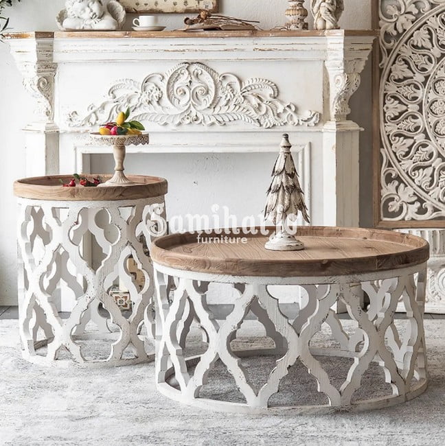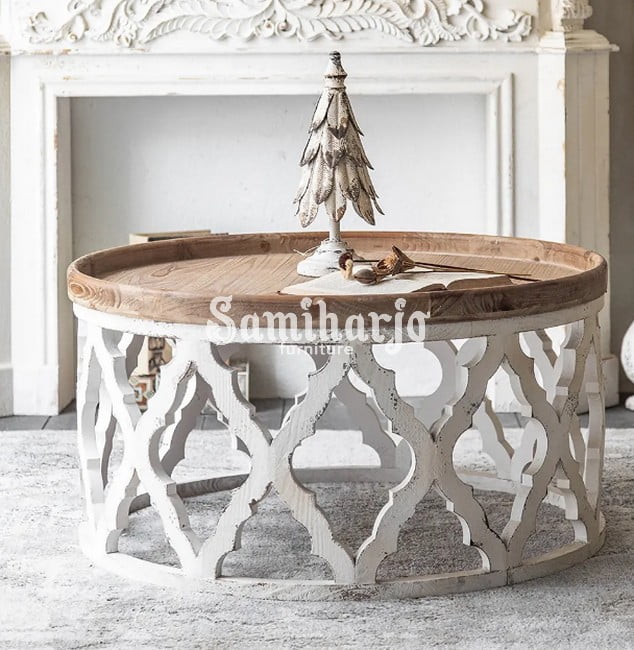 Meja Kopi Bulat Kayu Rustik Putih Ukir Model Kekinian Murah