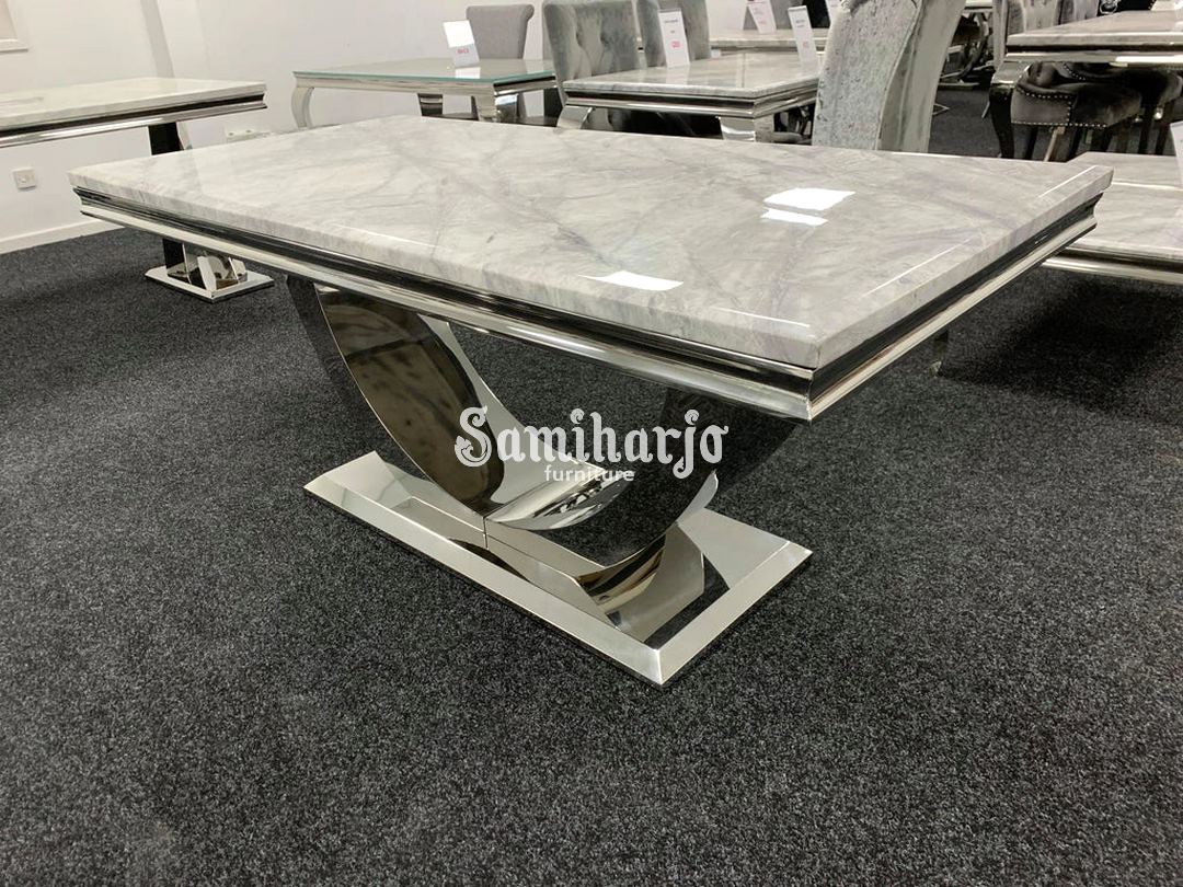 Meja Makan Lengkung Stainless terbuat dari rangka logam krom yang kokoh dengan kaki melengkung yang menawan, ia menawarkan tampilan gaya dan kualitas yang tak lekang oleh waktu. Bagian atas marmer berada di atas rangka dan diberi lapisan warna marmer abu-abu.