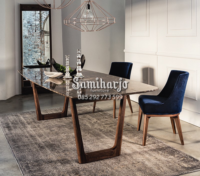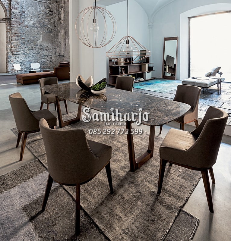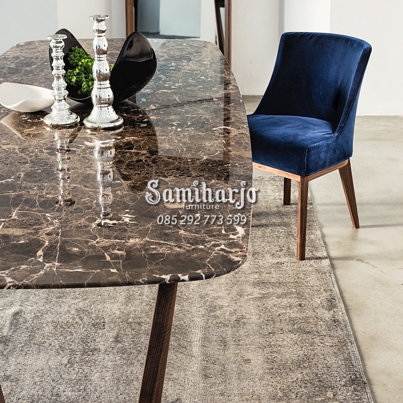 Meja Makan Marmer Emperador Mewah Kaki Kayu Solid Elegan Modern adalah model kontemporer namun klasik yang juga mencakup set kursi makan Sangat nyaman, Meja Makan Marmer Emperador memiliki alas dari kayu Solid atau abu bernoda moka (coklat tua) dan kursi berlapis kain dengan berbagai jenis kulit dan kain.
