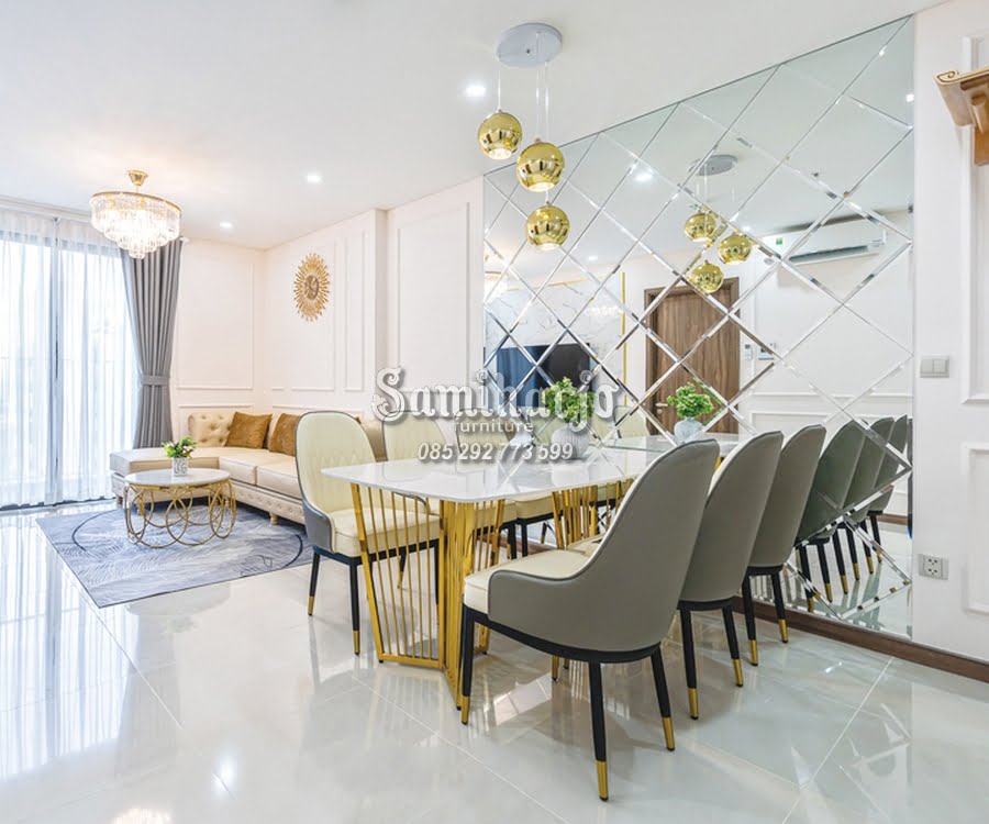 Set Meja Makan Marmer Putih Mewah Ruji segitiga batu high-end yang mewah. Model dirancang dalam gaya Nordik. Dengan rangka baja tahan karat Stainless Steel 304 berlapis emas dengan batu Polaris impor berkualitas tinggi. Tahan air, daya tahan tinggi. Sorotan dari produk ini adalah kaki meja dengan desain kaki kolom yang terbagi rata menjadi 3 sudut dengan aksen jeruji. Ini memastikan estetika, fungsionalitas, dan posisi yang nyaman bagi penghuninya. Palang vertikal yang dirancang dengan hati-hati di kaki meja menambah pesona produk Meja Makan Marmer Putih ini.