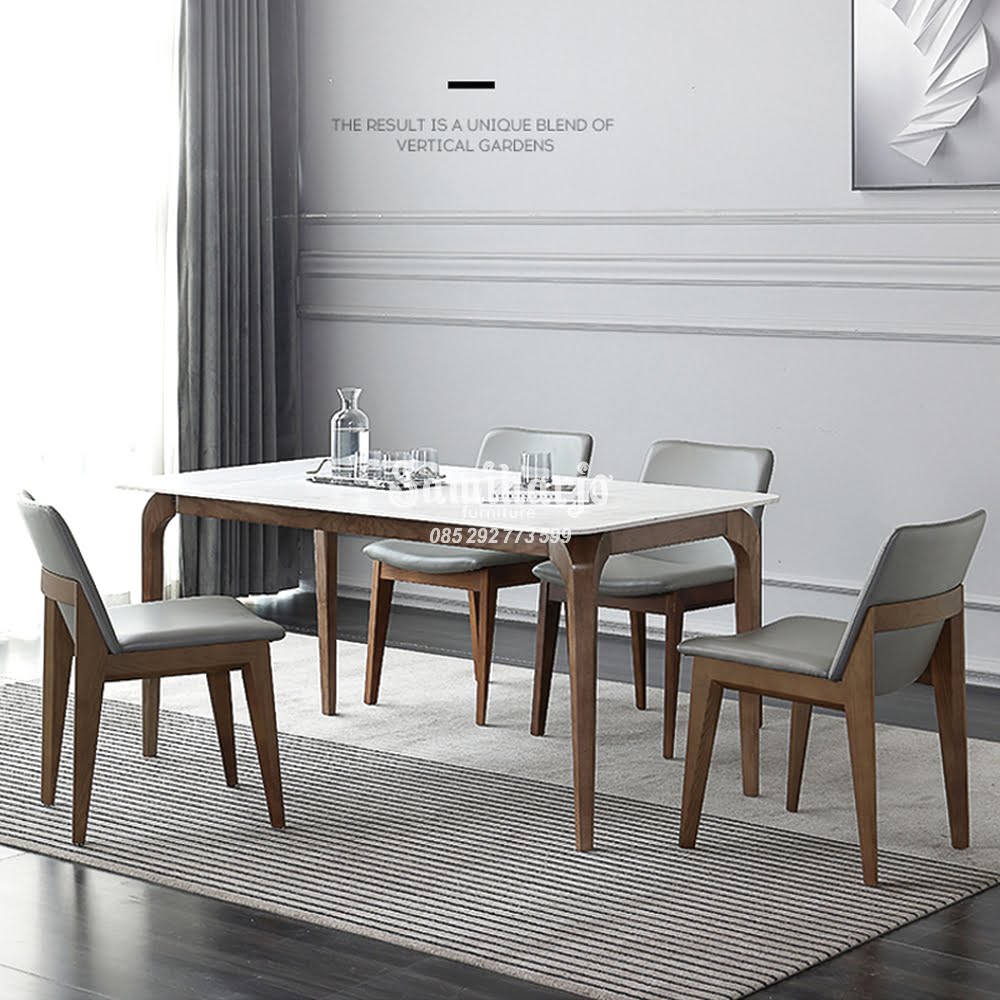 Dengan gaya desain modern, garis minimalis. Set meja makan kayu alami memberi pengguna sudut makan yang sangat rapi dan nyaman. Produk ini didesain dengan 1 meja makan top marmer, 4 kursi minimalis.