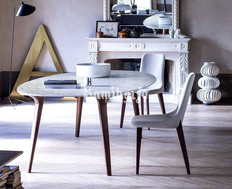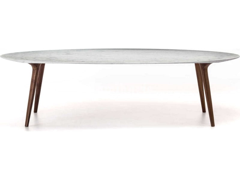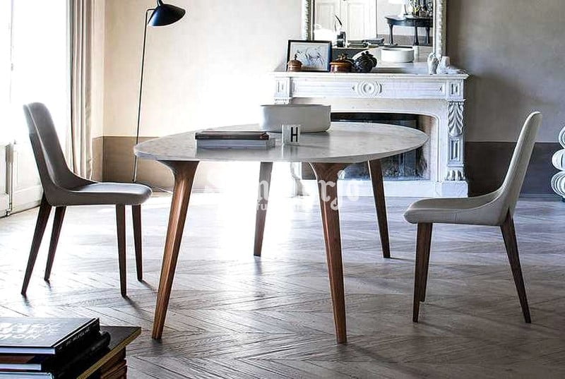 Meja Marmer oval Romendale didasarkan pada tema keramahan dan dapat menampung 8 orang dengan nyaman. Bentuk elips dan 4 bevel dalam menjadi ciri permukaan atas, terbuat dari marmer Carrara putih terbaik. Kaki meja berbahan kayu jati yang solid, menopang bagian atas sesuai dengan logika organik dan kontinuitas konsep. Berkat bahan solid, Meja Marmer oval dibuat untuk dimasukkan ke dalam banyak lingkungan berbeda.