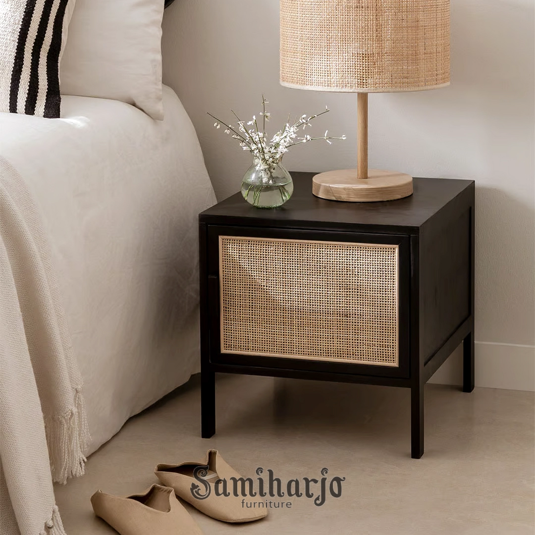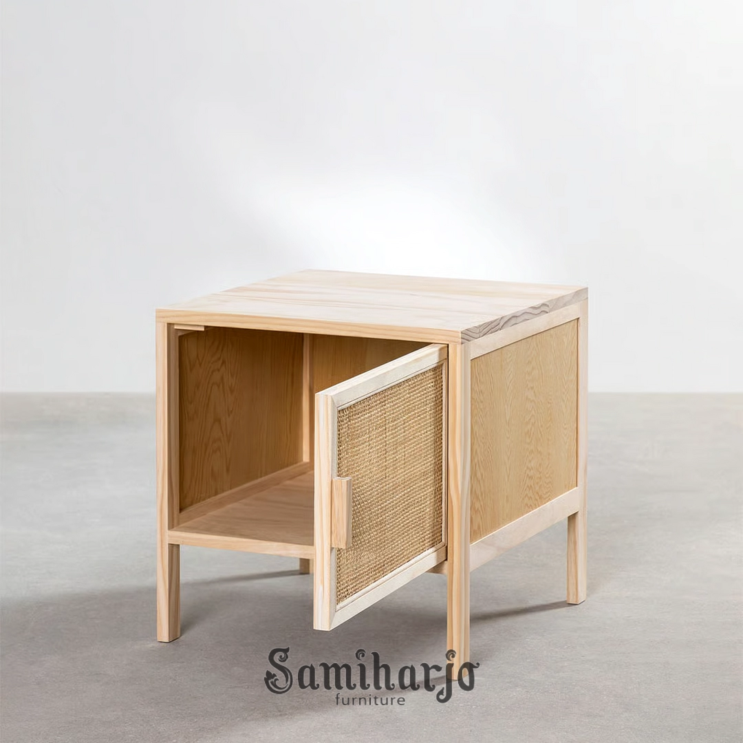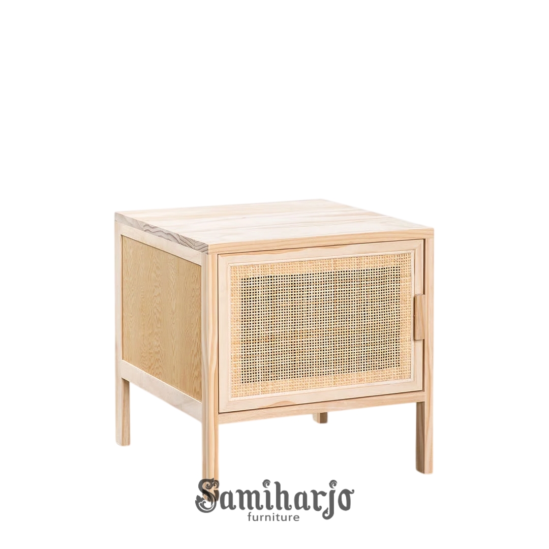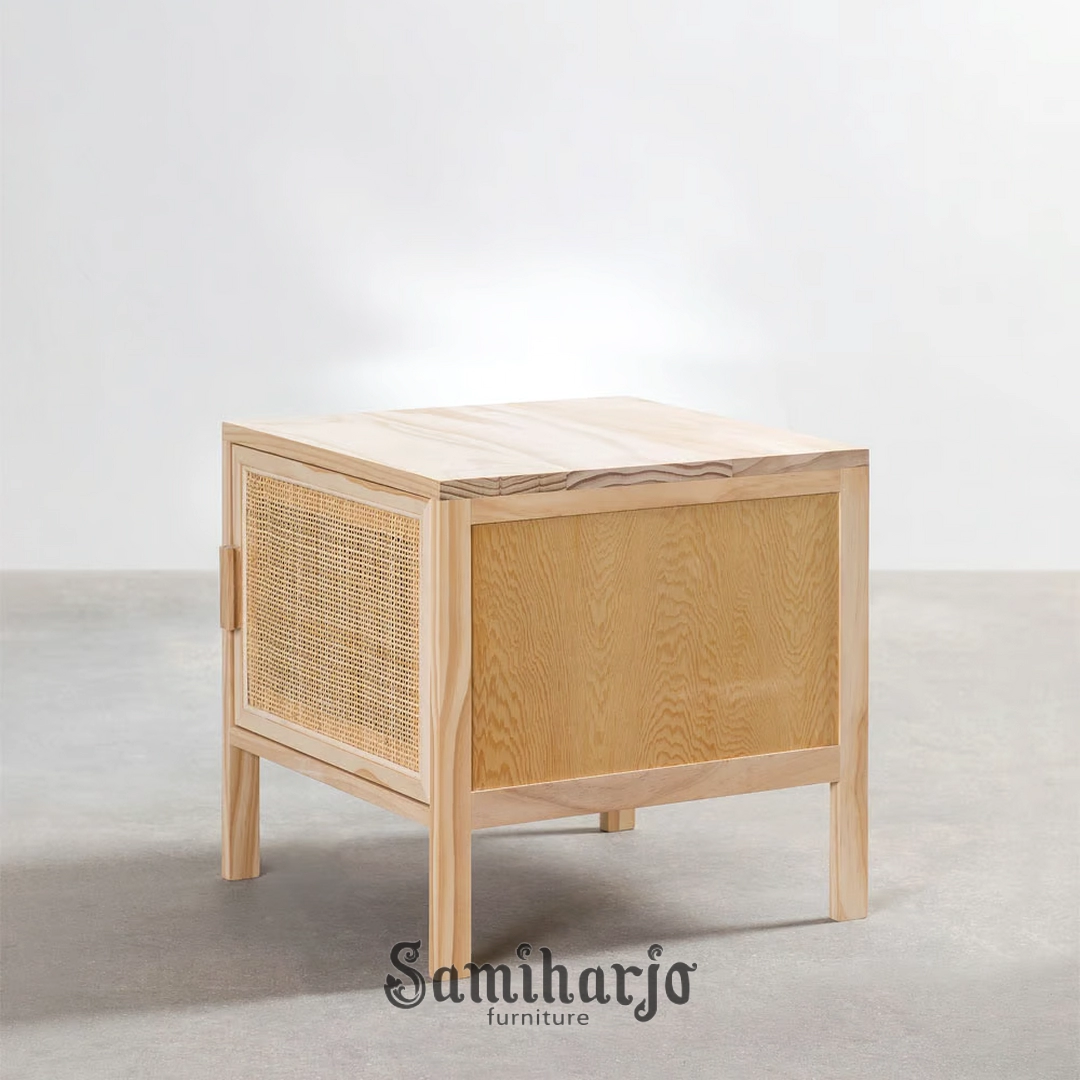Meja nakas ini cocok bagi Anda yang menyukai ruang tertata rapi tanpa banyak ornamen. Pintu anyaman rotan berfungsi sebagai aksen sekaligus ventilasi alami, membuat furnitur tampak lebih hidup. Proporsi yang seimbang menjadikannya mudah ditempatkan di sisi tempat tidur maupun area lain sebagai meja samping multifungsi.