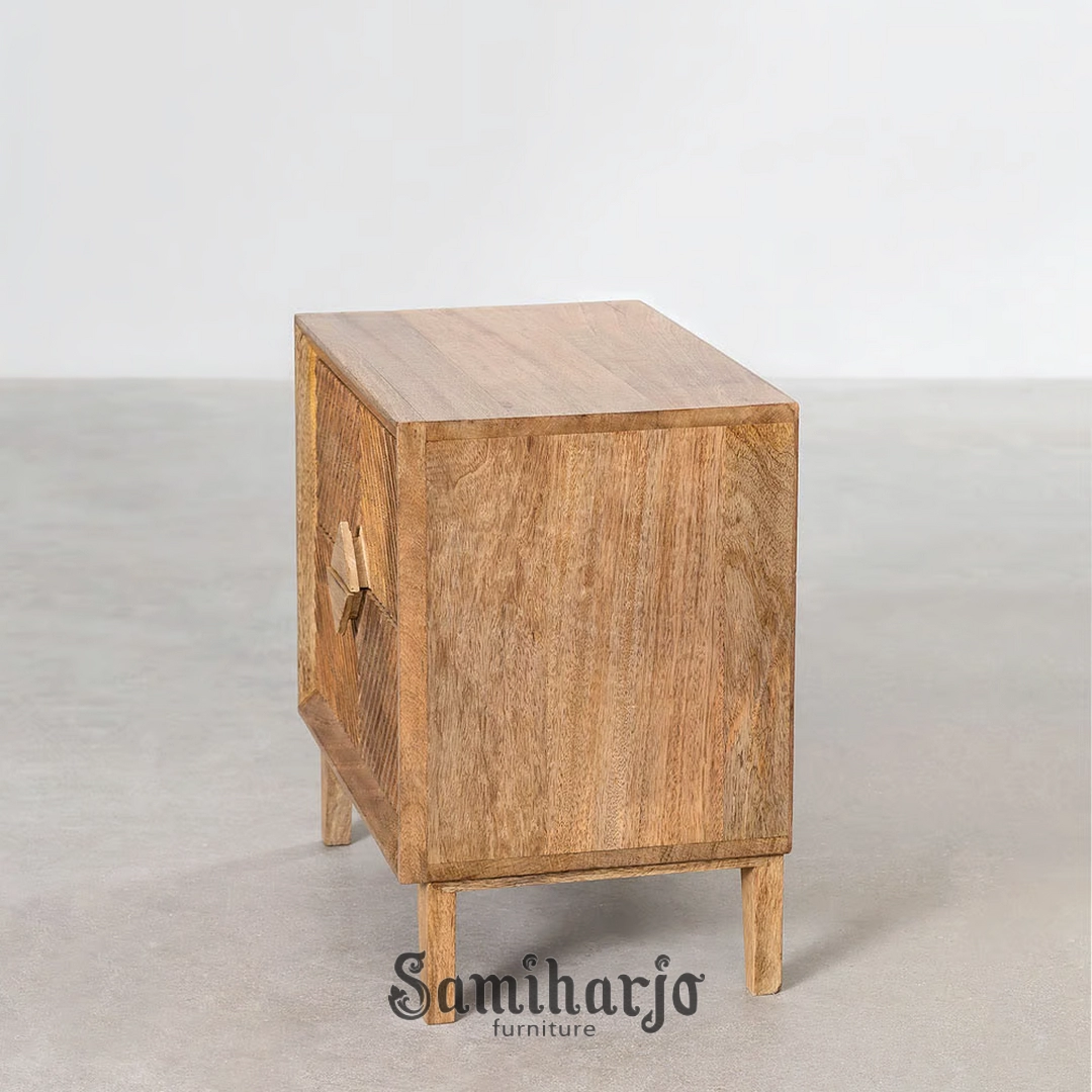 Menghadirkan karakter kuat sekaligus sentuhan artistik, nakas kayu ukir ini dirancang bagi Anda yang ingin menjadikan furnitur sebagai elemen ekspresi ruang. Tampilan depannya langsung mencuri perhatian melalui pola ukiran diagonal yang membentuk komposisi geometris berlapis. Setiap garis ukir memantulkan cahaya secara berbeda, menciptakan permainan bayangan yang memberi kedalaman visual pada kamar tidur.