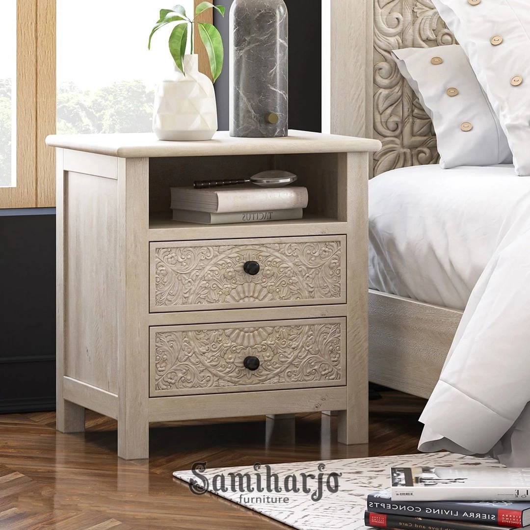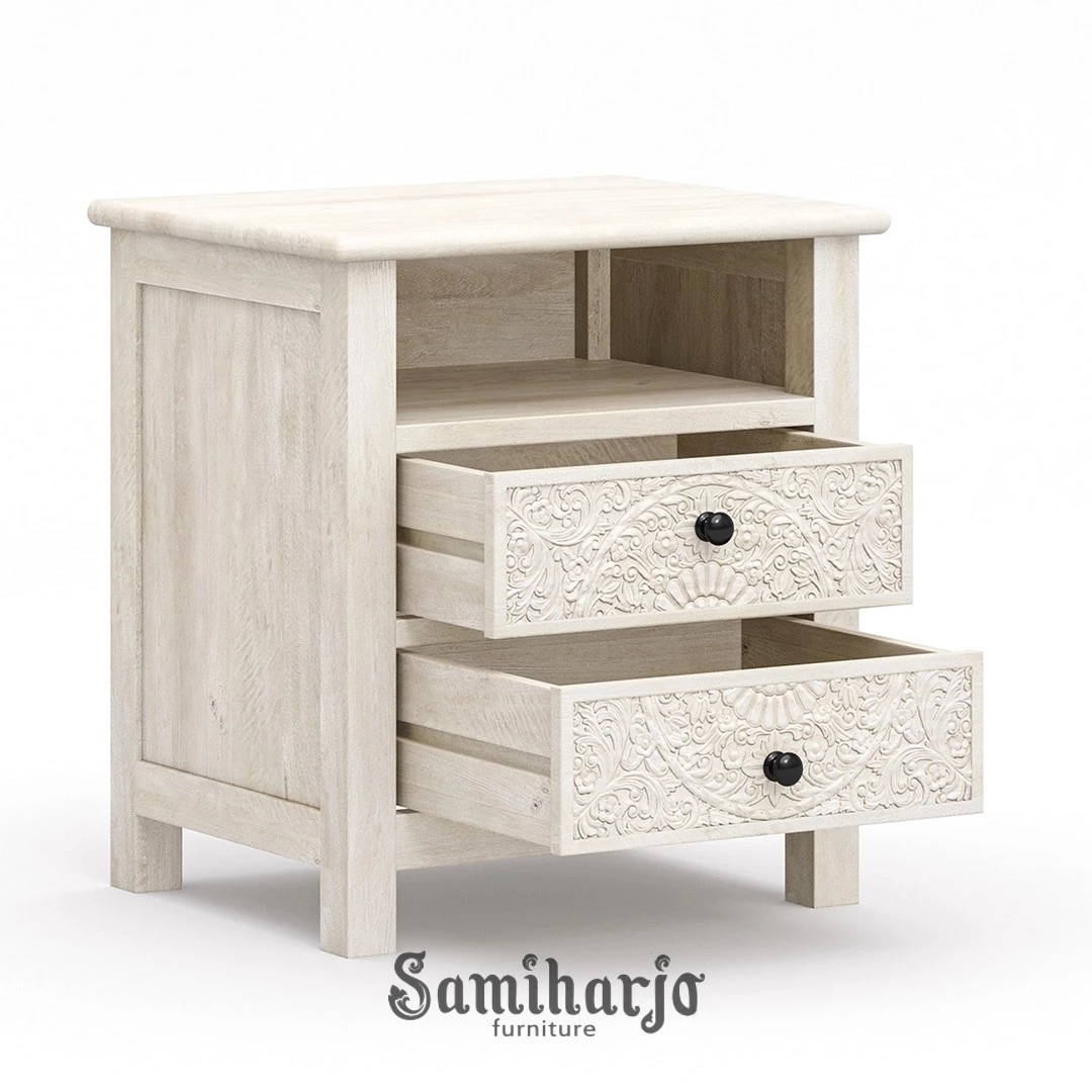 Meja Nakas Ukiran Putih Calistoga menghadirkan keindahan detail ukiran klasik dalam balutan warna putih wash yang lembut dan menenangkan. Dari pandangan pertama, karakter artistik langsung terasa melalui panel laci berukir floral simetris yang dikerjakan detail dan presisi. Warna putih natural tidak menutup tekstur kayu, justru menonjolkan serat halus yang memberi kesan hangat dan autentik. Produk ini dirancang untuk Anda yang ingin kamar tidur tampil lebih cerah, rapi, dan berkelas tanpa kesan berlebihan.