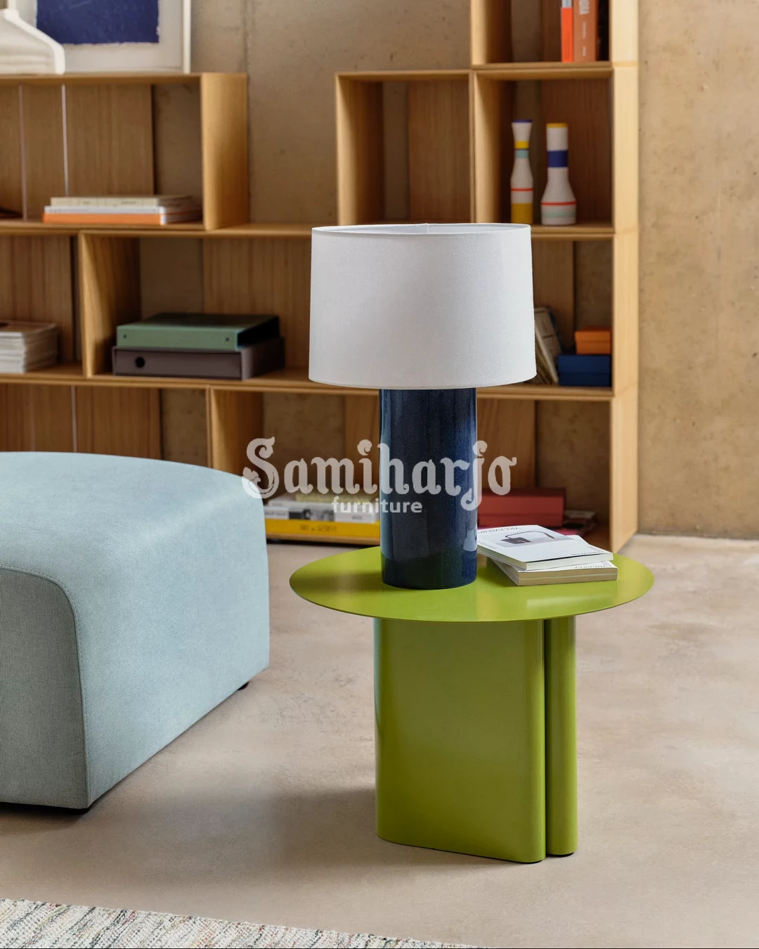 Meja samping ini menghadirkan pendekatan desain modern yang segar melalui permainan bentuk sederhana, warna berkarakter, dan proporsi yang sangat terkontrol. Visualnya langsung menarik perhatian berkat kombinasi top bundar tipis dan kaki pedestal berbentuk panel melengkung yang tampak sculptural.