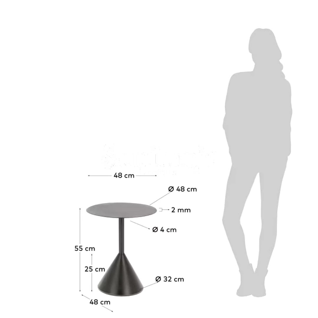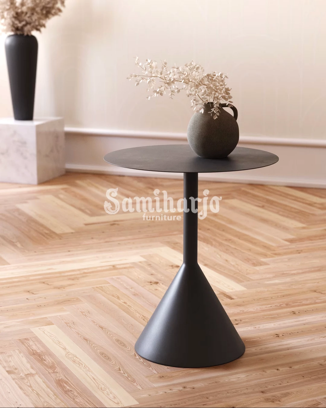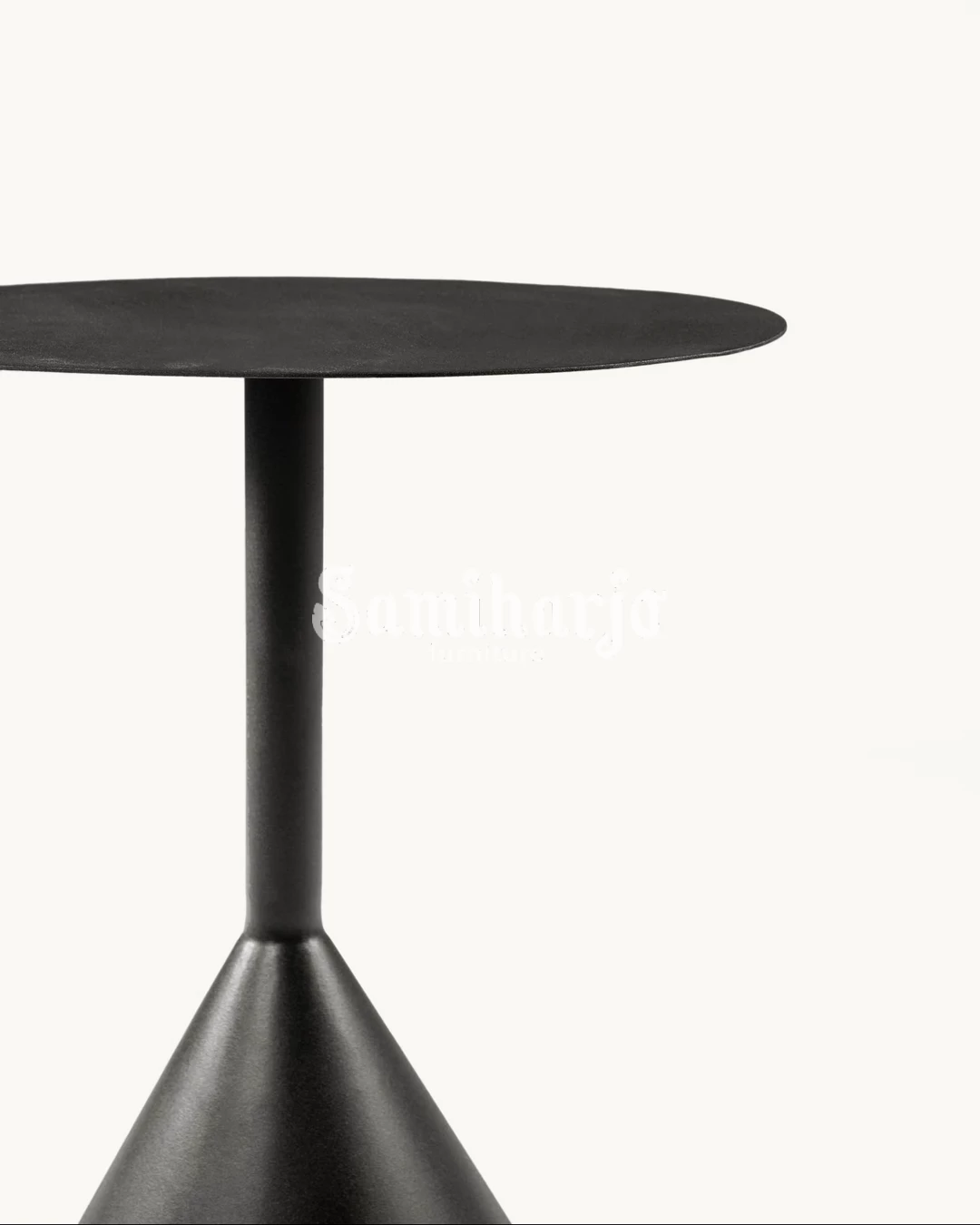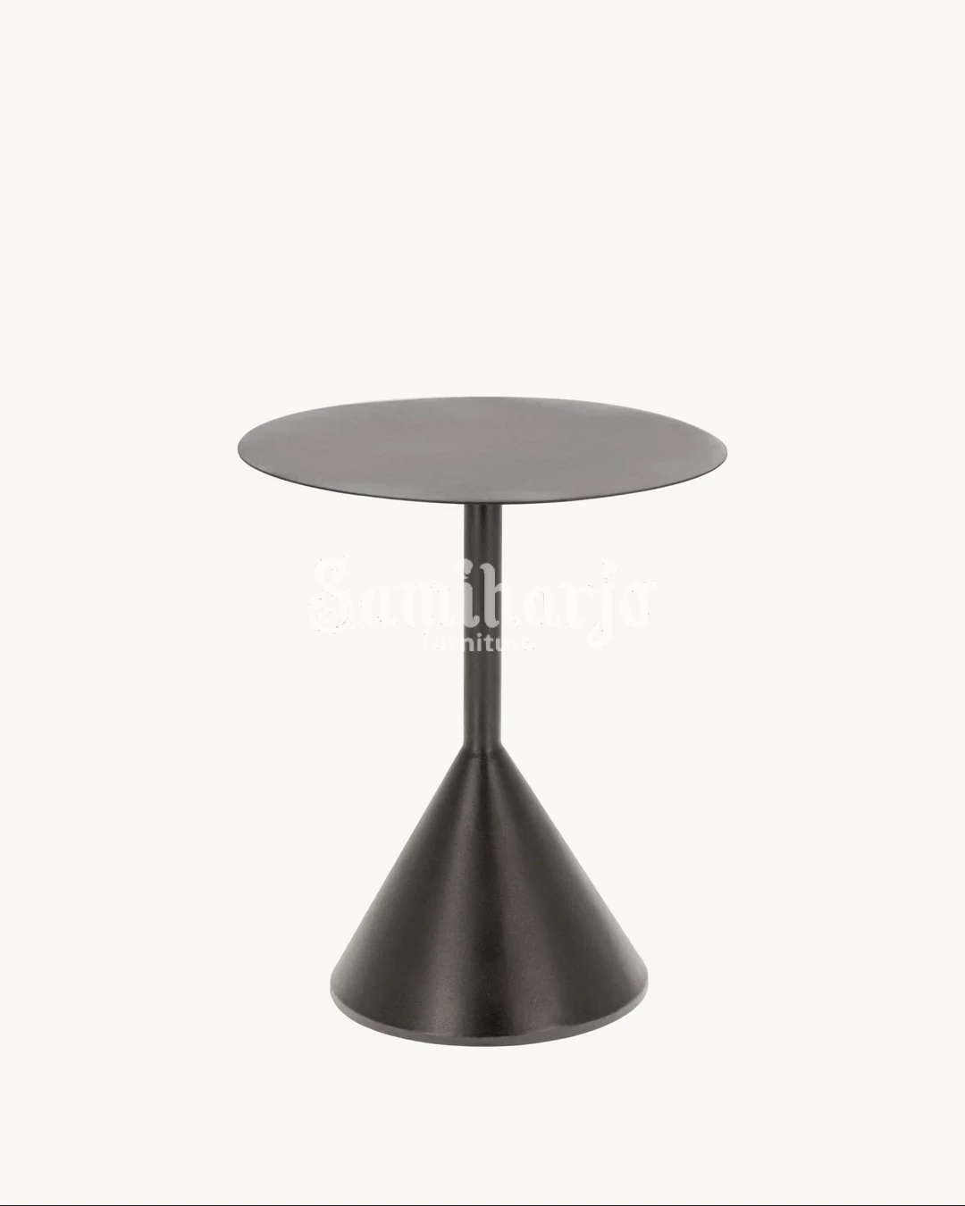 Meja samping ini mengusung desain pedestal metal dengan karakter modern dan bentuk kerucut yang tegas. Permukaan bundar yang tipis dipadukan dengan kaki tengah ramping serta base melebar, menciptakan kesan stabil sekaligus ringan secara visual.