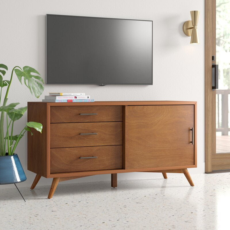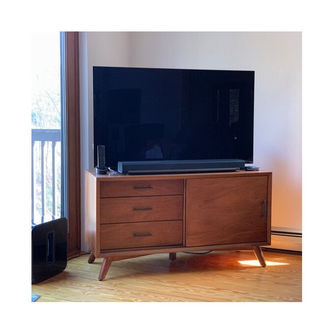 Meja TV Retro Klasik 120 cm Bahan Kayu Jati sangat cantik untuk kebutuhan furniture Anda. Tidak hanya memberikan tampilan yang ramping ke ruang tamu Anda, tetapi juga dilengkapi dengan penyimpanan tersembunyi yang kami impikan. Dibuat dari kayu solid, Bufet Tv ini memiliki tiga laci di satu sisi dan lemari dengan pintu geser di sisi lain, sehingga Anda dapat dengan mudah menyimpan kotak kabel atau konsol game. Selain itu, guntingan manajemen kabel di bagian belakang berarti Anda dapat dengan mudah menyembunyikan kabel dari pandangan. Meja ini dapat menampung hingga TV 55 ”, dan sudah terpasang sepenuhnya (pemasangan mudah).