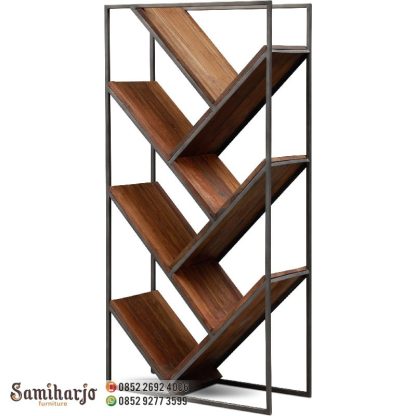 Kokoh dalam Gaya, tetapi hemat ruangan. Rak Buku Besi Geometris Minimalis Papan Kayu menunjukkan sifat kehidupan yang selalu berubah dan organik. rangka besi minimalis dan kayu berwarna gelap dengan variasi serat alami sesuai dengan gaya industri seni modern, sementara rak diagonal yang tumbuh seperti makhluk hidup dari akar metal. Papan kayu tebal berada bertumpu rangka logam minimalis yang modern, sehingga menampilkan estetika buatan tangan khas pada karya ini.