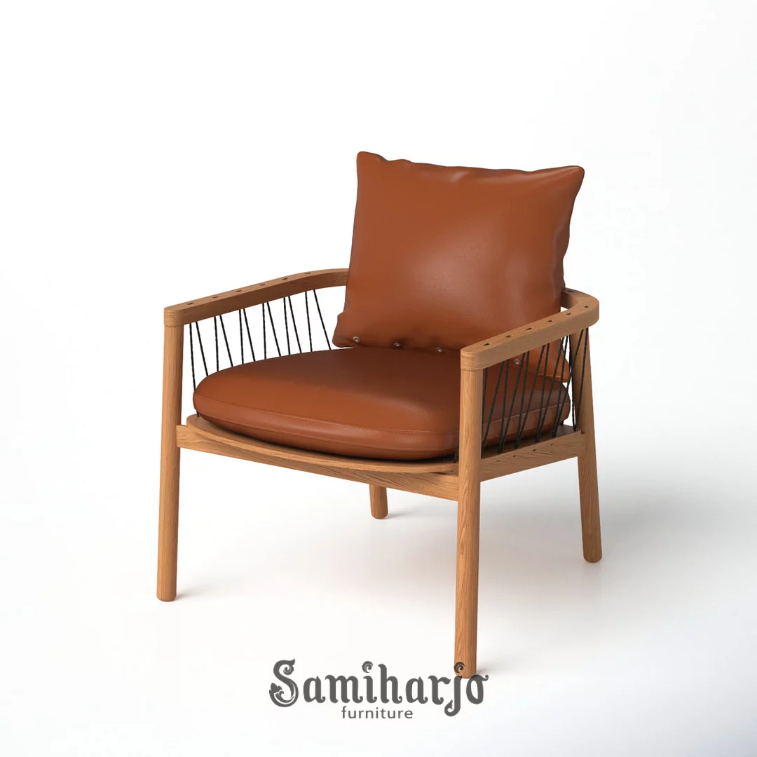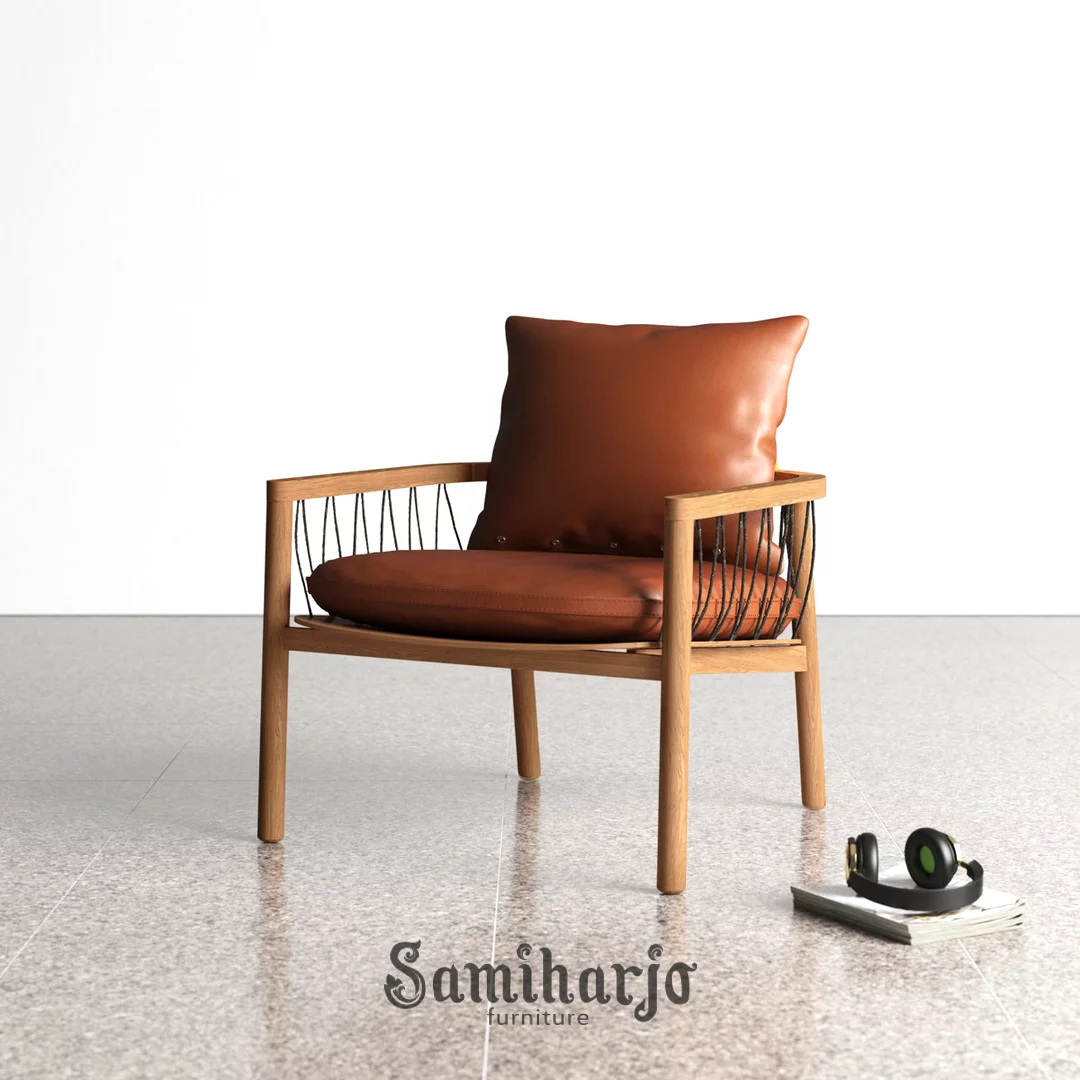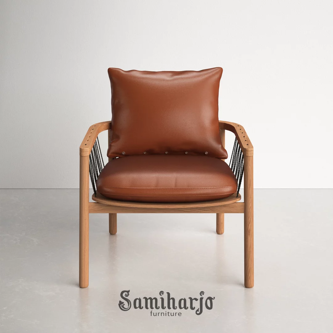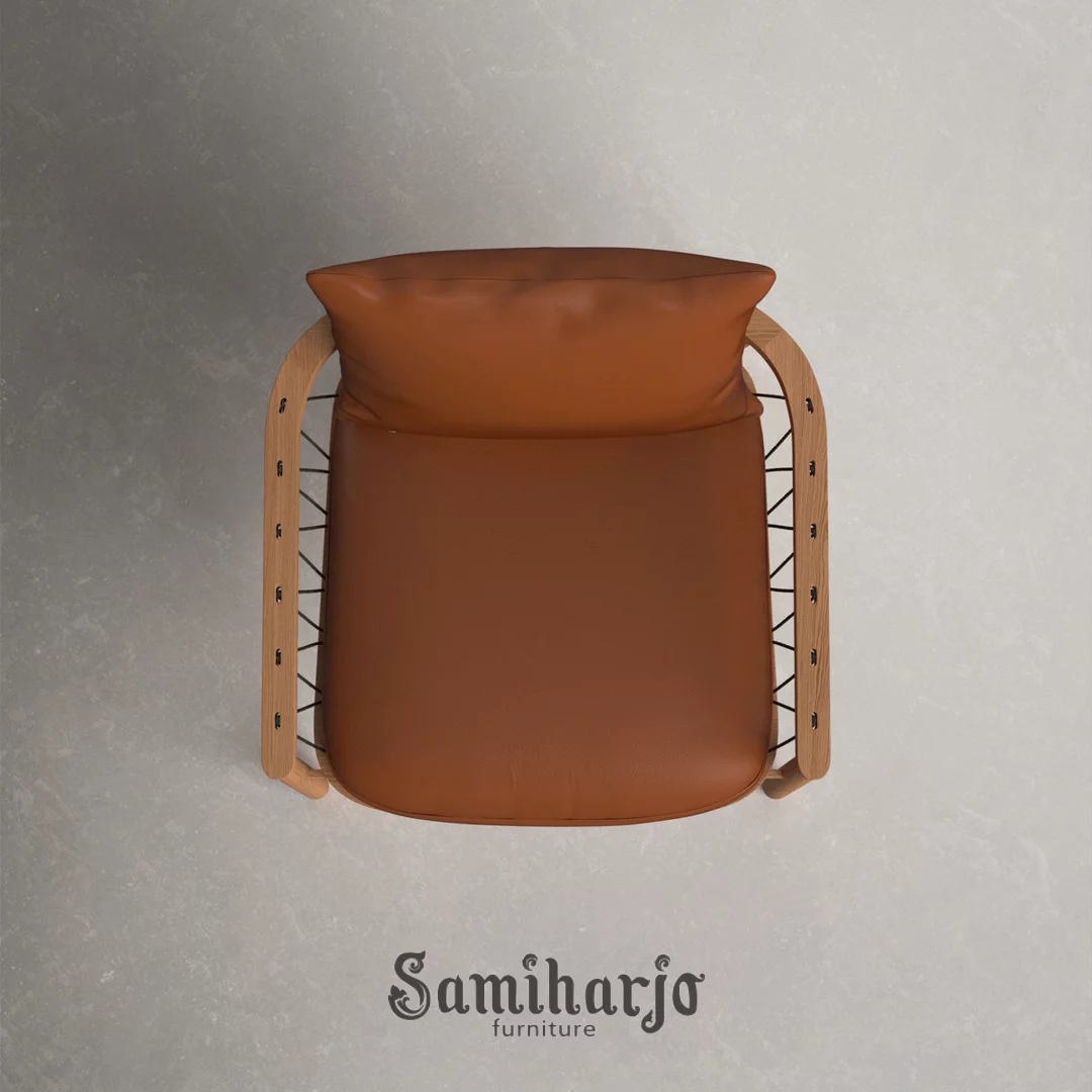 Reading nook chair ini dirancang untuk menghadirkan suasana duduk yang tenang dan personal melalui pendekatan desain modern organic. Kombinasi kayu solid natural, upholstery leather coklat hangat, serta detail rope di sisi kursi menciptakan karakter visual yang ringan namun berkelas.