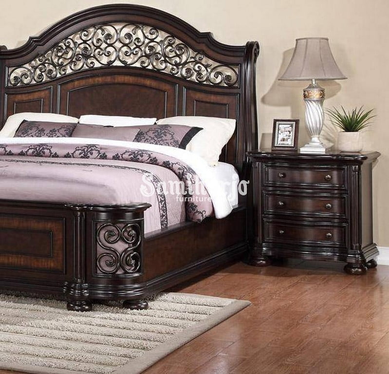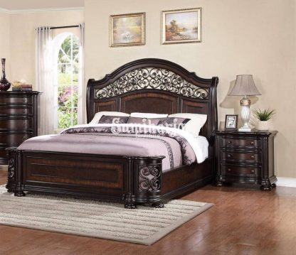 Ini adalah tempat tidur bergaya giring yang memiliki sandaran kepala tinggi, dan penggulung unik yang dirancang di kepala tempat tidur dan papan kaki yang menciptakan gaya tradisional yang lebih lembut untuk set kamar tidur ini.