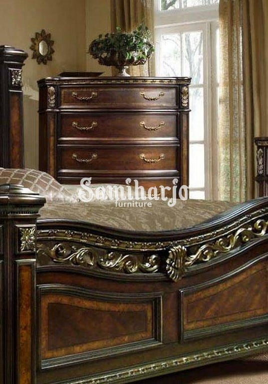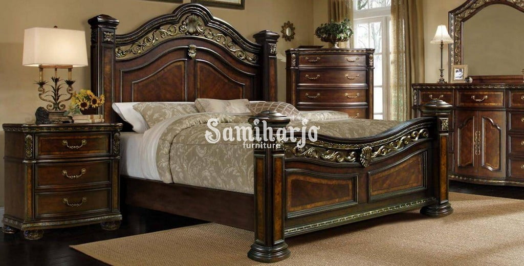 Ada dua tiang besar yang berdiri sebagai penjaga di kepala sementara dua tiang yang lebih pendek menjaga kaki. Di antara tiang-tiang tersebut terdapat latar belakang untuk pelapis halus, ukiran rumit, dan ukiran yang dirancang dengan cermat. Keduanya cantik dengan pita lebar logam kuningan antik dibuat dengan cermat. Meskipun gaya ini mengingatkan pada pengaruh Tuscan atau Mediterania, gaya ini memiliki daya tarik tradisional yang luas. Tempat Tidur Klasik menawarkan hasil akhir yang luar biasa dan merupakan kesaksian atas keahlian dan presisi yang digunakan dalam pembuatannya.