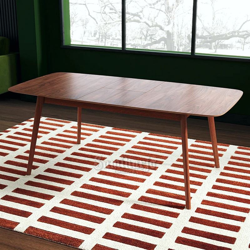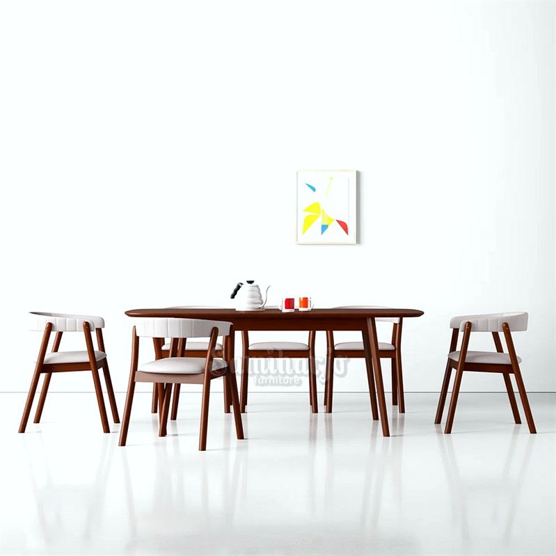 Set meja makan ini tampil elegan dengan bentuk persegi panjang dan sudut meja membulat yang memberi kesan lembut. Kursinya dirancang dengan sandaran melengkung dan bantalan duduk empuk, nyaman untuk makan bersama keluarga. Warna kayu coklat tua menambah nuansa hangat dan modern di ruang makan Anda.