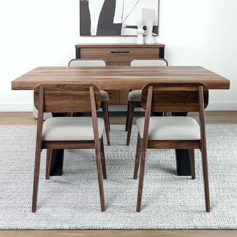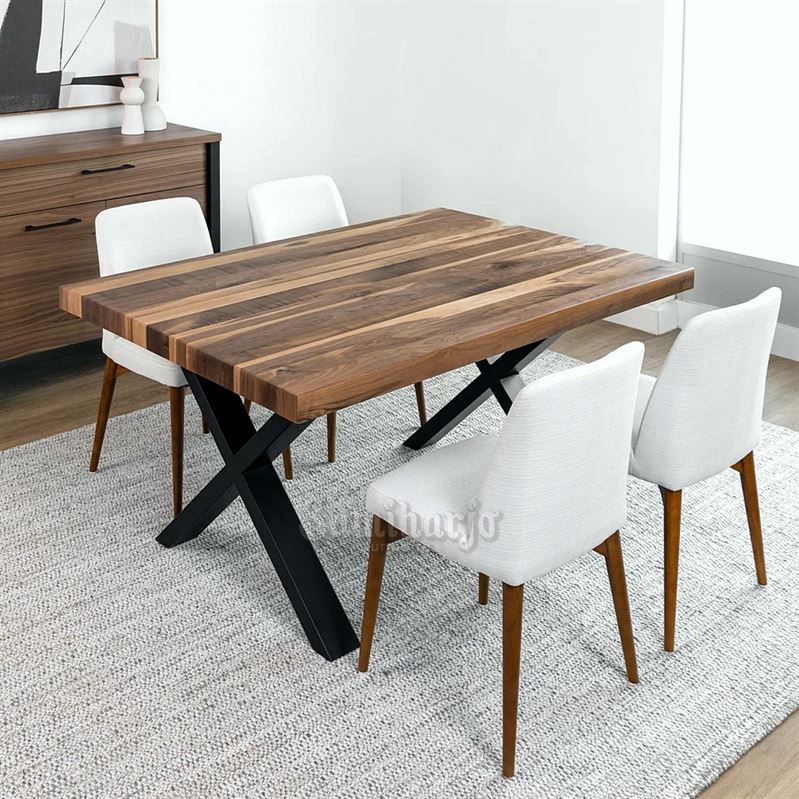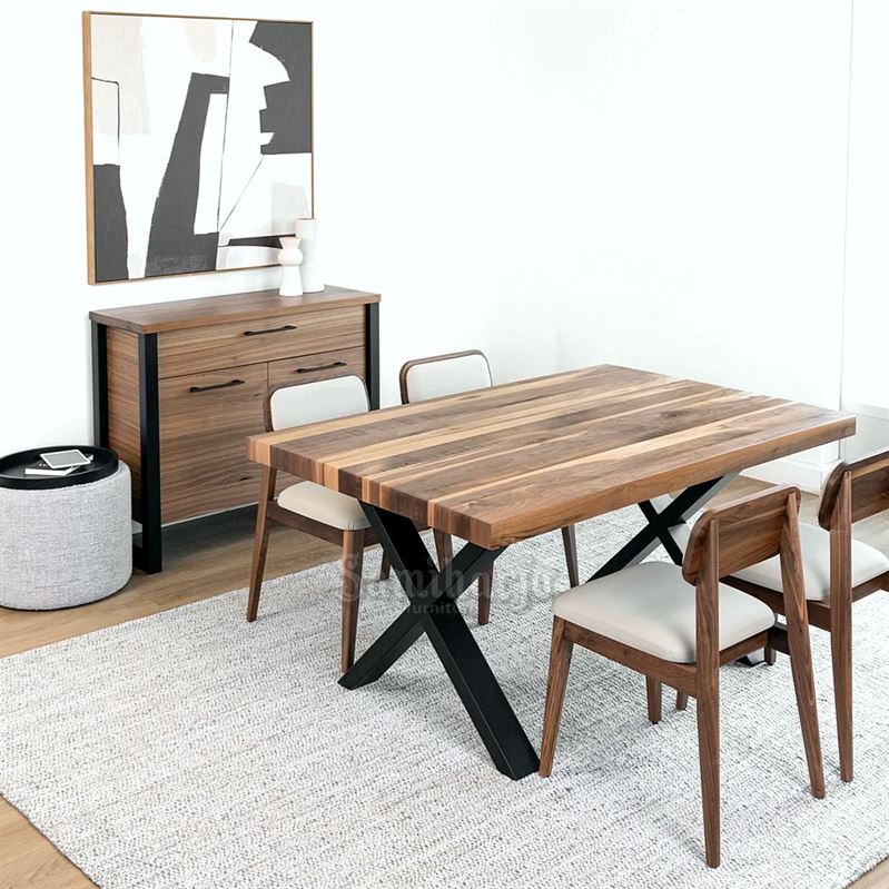 Set meja makan ini memadukan kayu dengan pola garis natural dan kaki besi silang berwarna hitam yang kuat. Desainnya modern bergaya industrial minimalis, cocok untuk ruang makan dengan nuansa hangat dan berkarakter. Untuk pemesanan silahkan kunjungi website kami: samiharjofurniture.com.