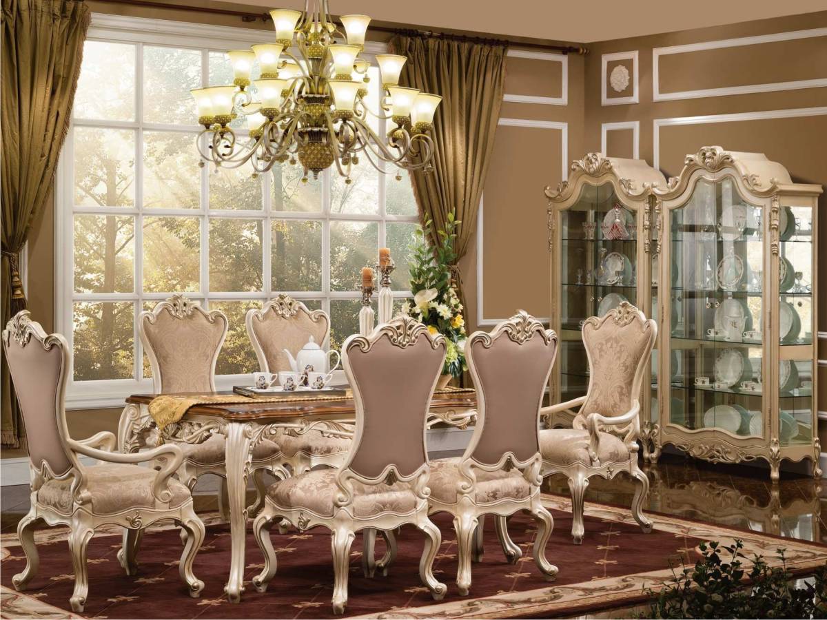 Set Meja Makan Luxury Luis Victorian dihiasi dengan fariasi. Set meja makan mewah dengan sentuhan dekorasi ukiran yang indah, penampilannya memberikan kesan klasik dan juga mewah. Rumah dengan furniture berkonsep Luxury dikombinasikan dengan set meja makan model seperti ini akan terlihat lebih memukau.