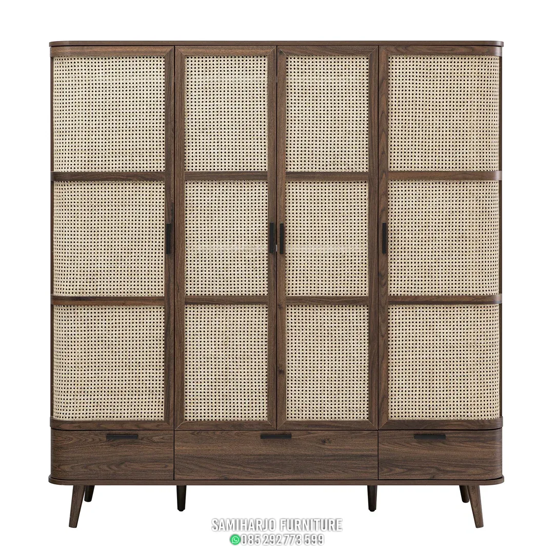 Kombinasi kayu solid dengan anyaman rotan menciptakan harmoni antara kekuatan dan keindahan alami. Permukaan finishing yang halus memperlihatkan karakter serat kayu yang autentik, memberikan kesan hangat dan eksklusif. Selain itu, desain lebar dengan empat pintu utama memungkinkan distribusi penyimpanan yang lebih terorganisir, cocok untuk kebutuhan rumah tangga modern maupun ruang tidur utama.