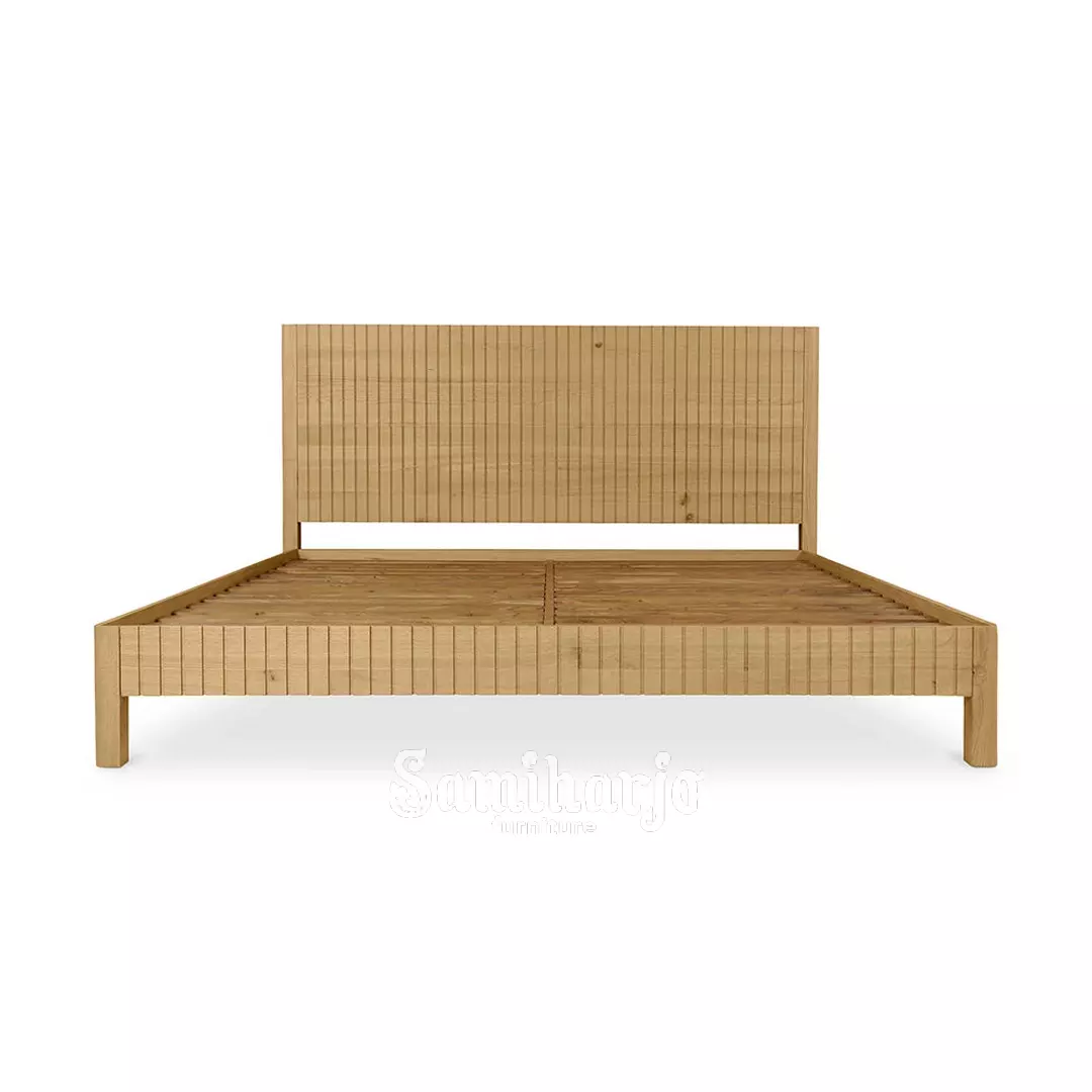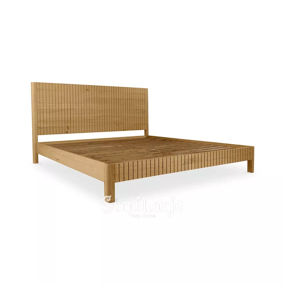 Tempat Tidur Linear Slat Zen memiliki rangka kayu jati solid dengan desain minimal modern.