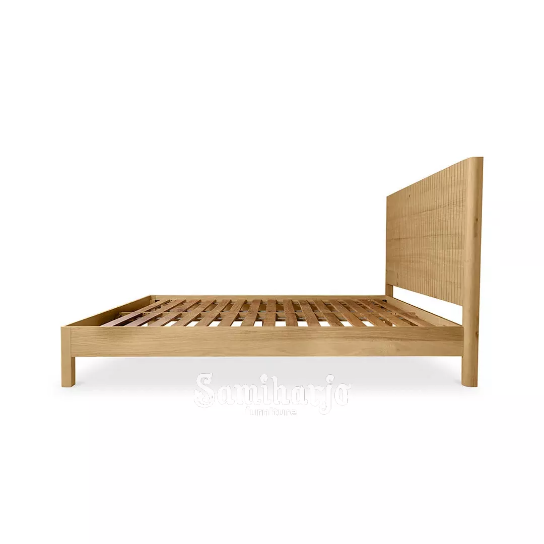 Pola slat vertikal juga diterapkan pada bagian footboard sehingga menciptakan kesatuan desain yang harmonis antara sandaran dan rangka ranjang.