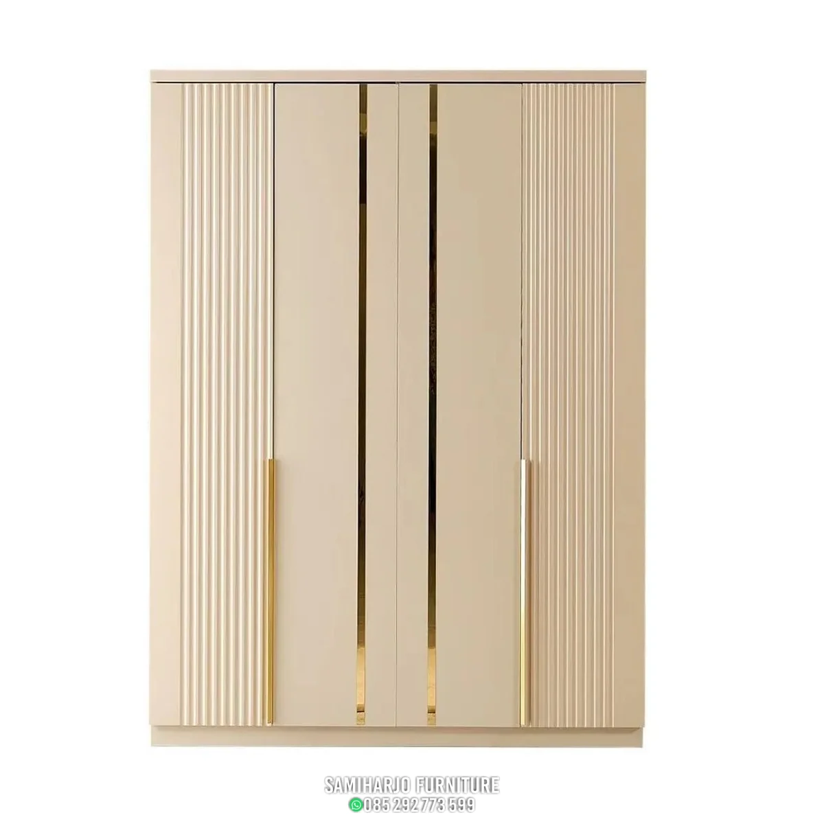 Kombinasi finishing halus dengan aksen metalik pada bagian tengah memberikan sentuhan eksklusif yang membedakan produk ini dari lemari konvensional. Desainnya yang simetris menciptakan keseimbangan visual yang kuat, menjadikan wardrobe ini sebagai pusat perhatian dalam ruang.