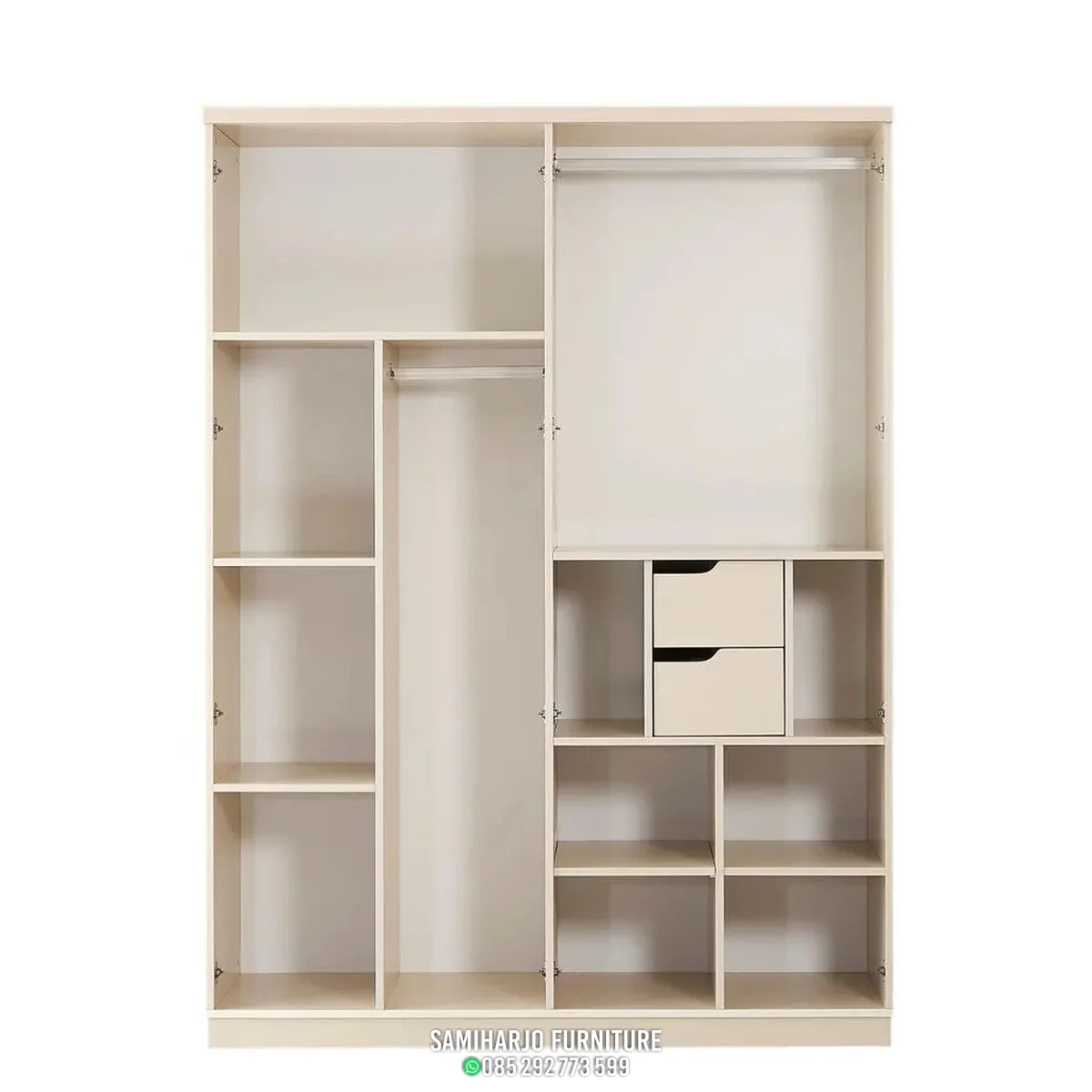 Interior lemari dirancang fungsional dengan ruang gantung luas serta rak tambahan untuk penyimpanan pakaian lipat dan aksesoris.