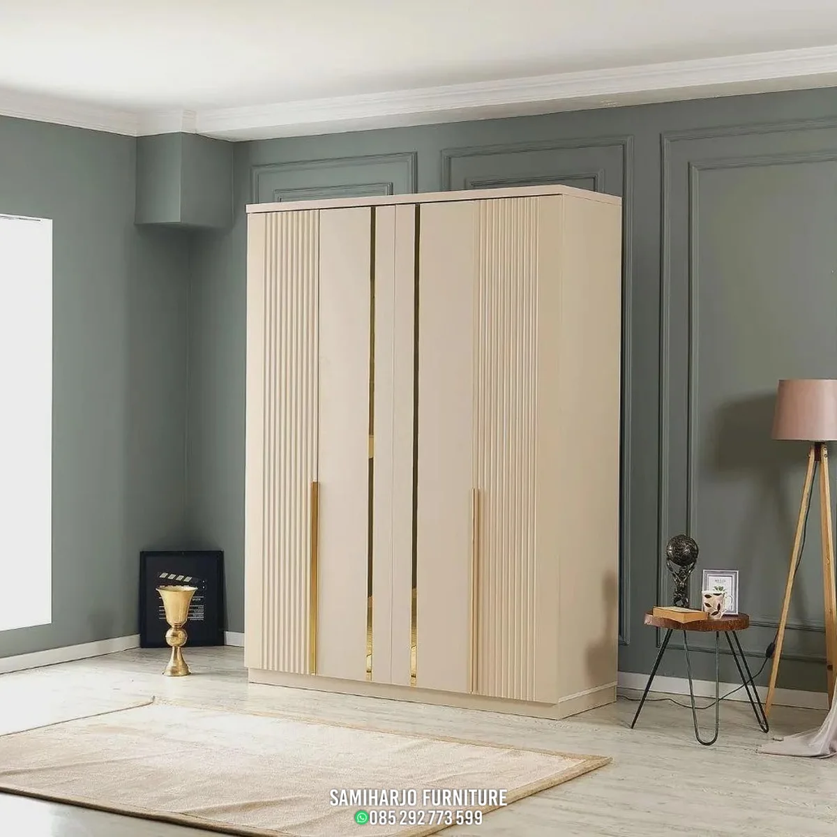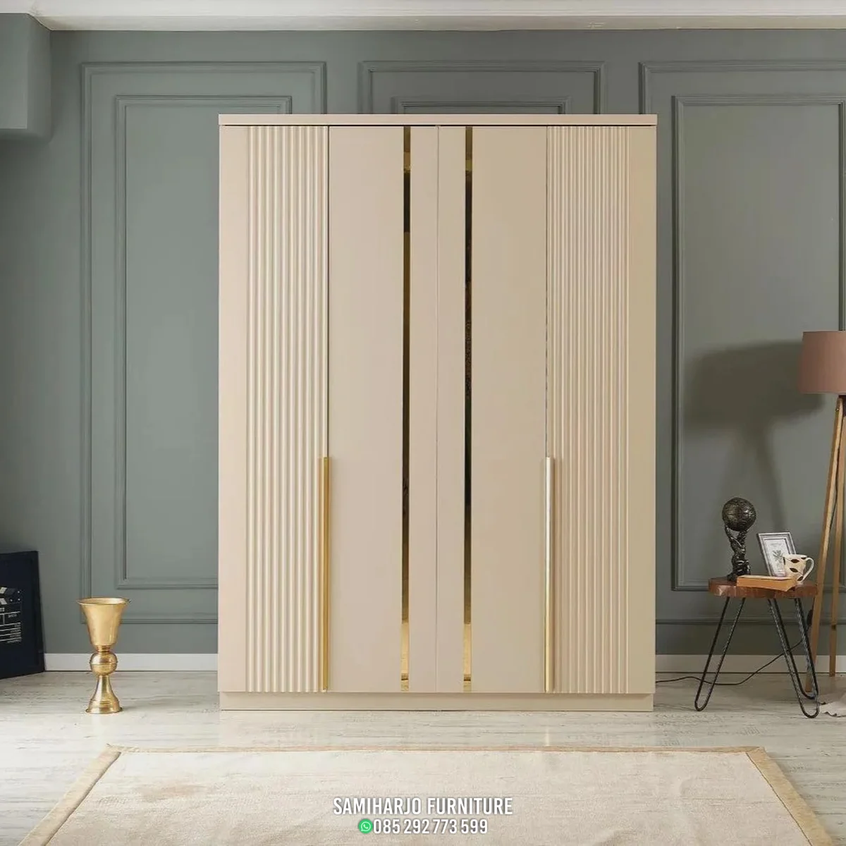 - Fitur tambahan: Panel fluted dekoratif, aksen metalik, desain simetris